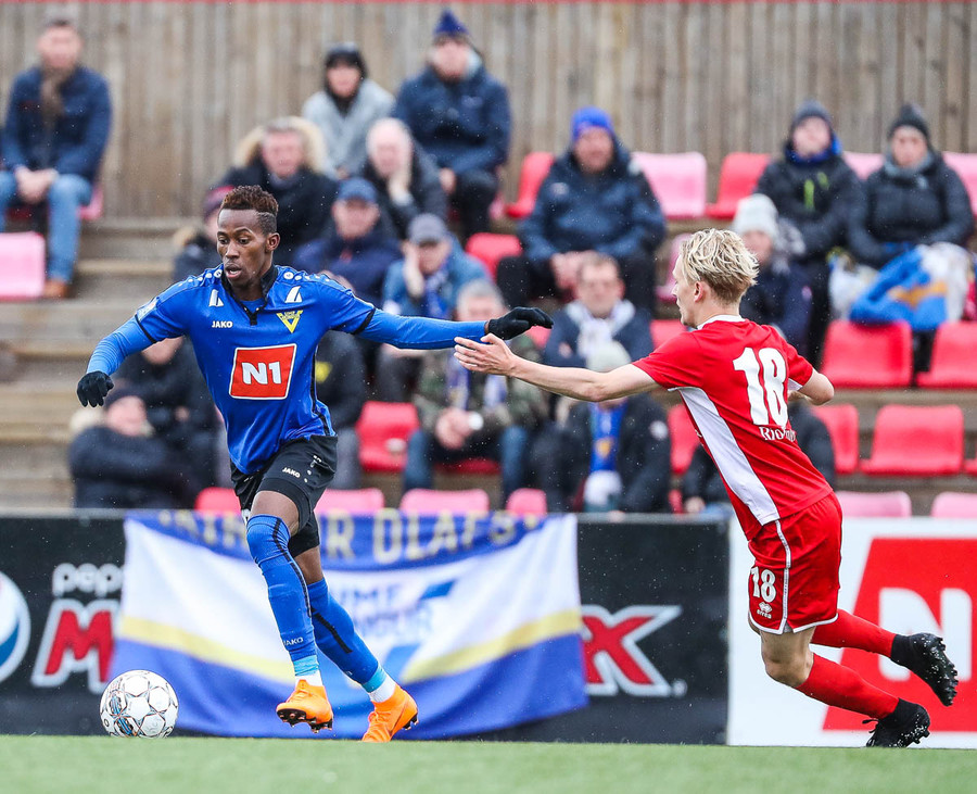 Víkingar eru miklu líklegri þessa stundina. Kröftugur sprettur frá Kwame upp miðjuna áður en hann leggur boltann fyrir Pape sem að ætlaði svoleiðis að smyrja hann í hornið en skotið hans var himinhátt yfir markið.