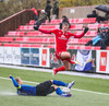 Davíð Ingvars liggur í grasinu eftir samskipti við Kwame. Víkingar hafa látið Davíð finna fyrir því í dag.