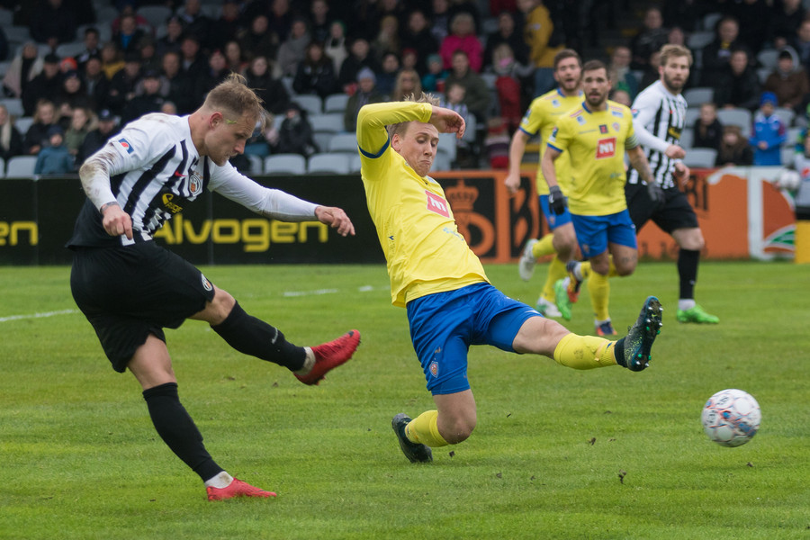 Björgvin reynir hér skot langt fyrir utan teig en það er beint á Aron í markinu.