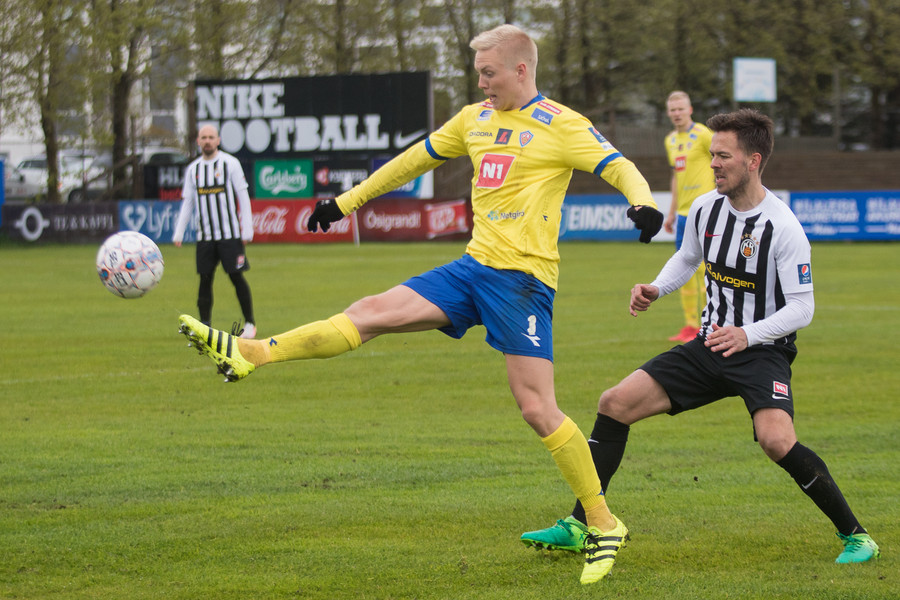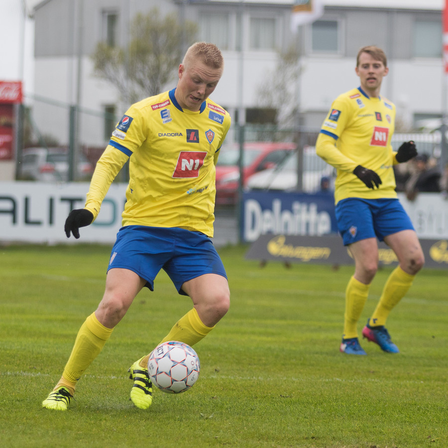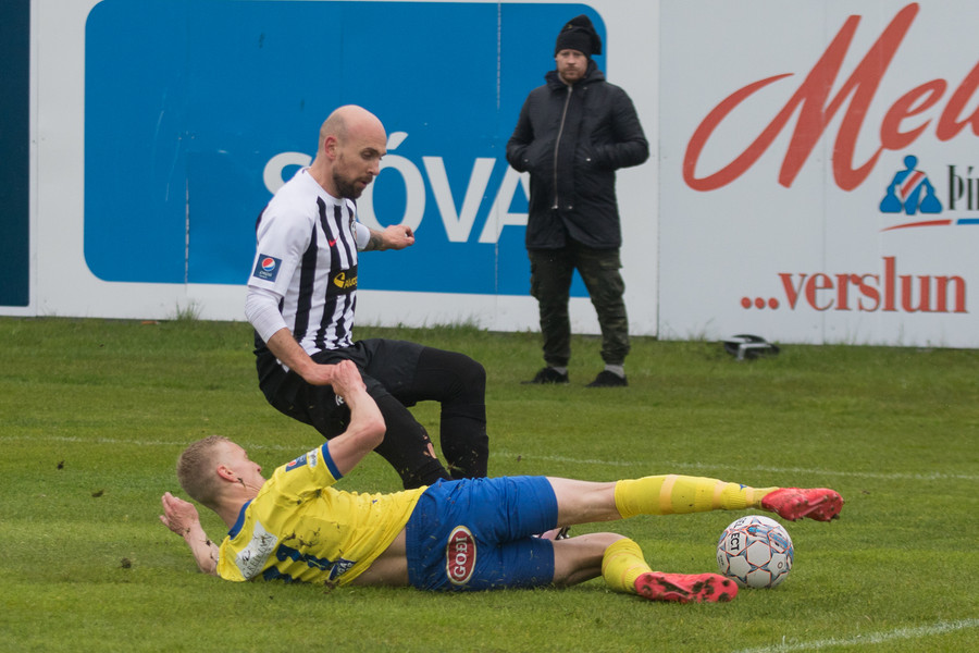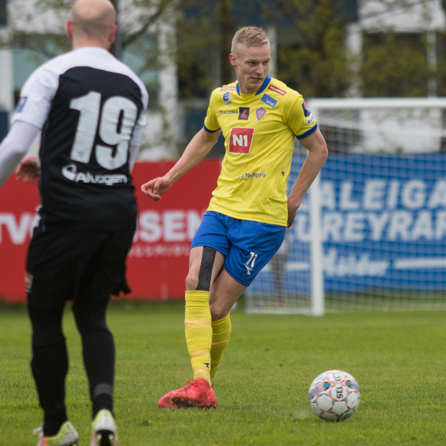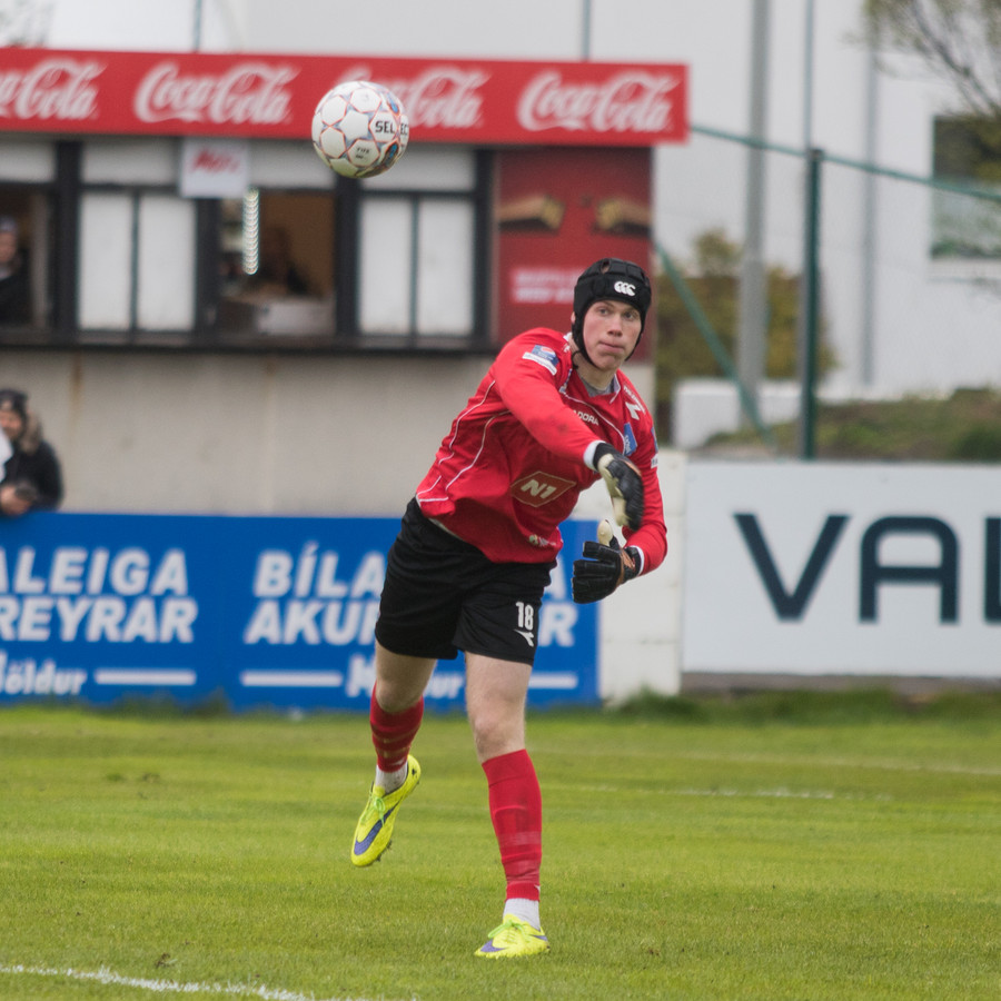 Hinn tvítugi Aron Elí Gíslason ver mark KA manna í dag en hann kom inní byrjunarliðið gegn Keflavík eftir að Cristian Martínez fékk höfuðhögg í upphitun.