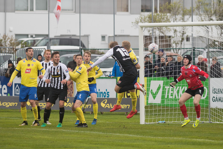 Hornspyrna Hallgríms ratar beint á kollinn á nafna hans sem að skallar yfir markið.