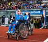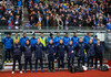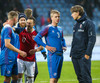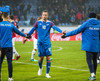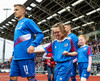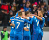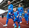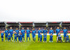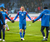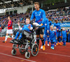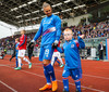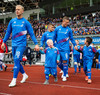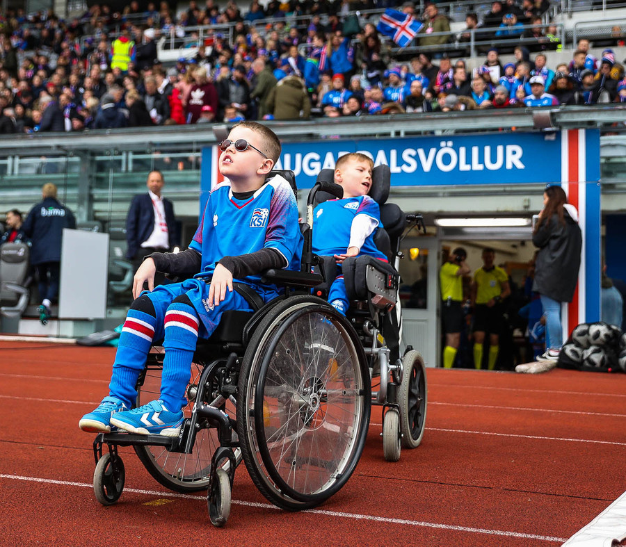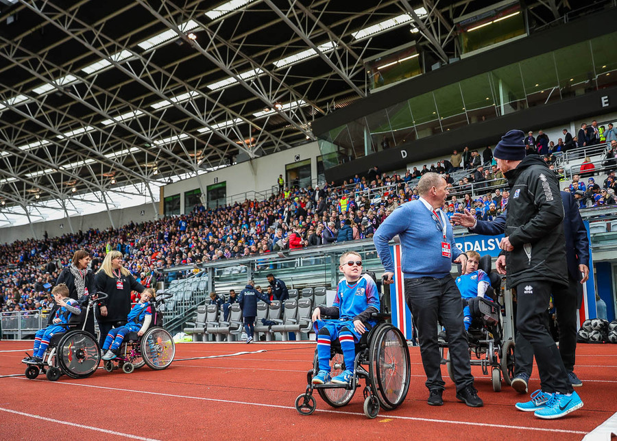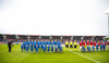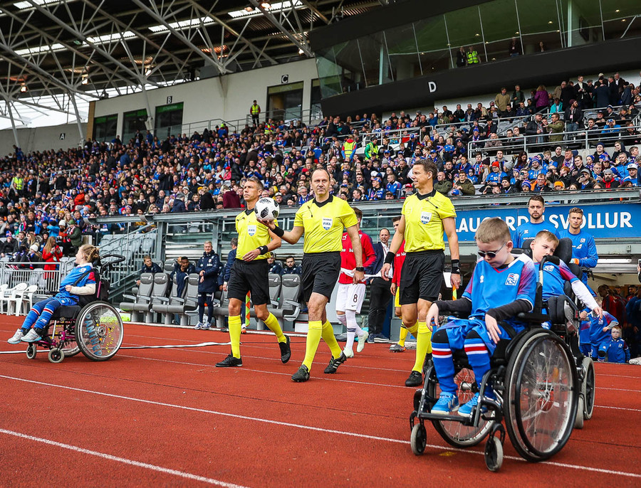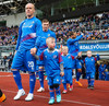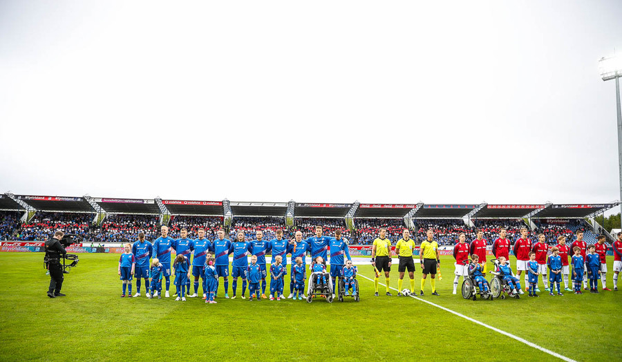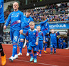 Leikmenn beggja liða ganga inn á völlinn með börn úr Klettaskóla með sér. Virkilega skemmtilegt. Þá er komið að þjóðsöngvum.