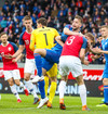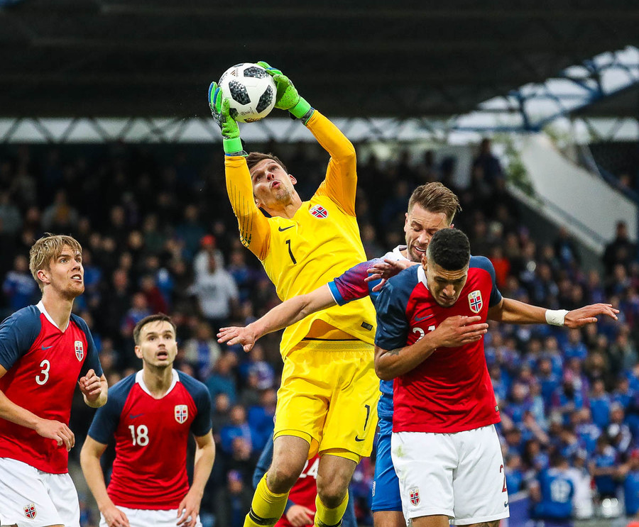 Norðmenn fá aukaspyrnu og það er Sander Berge sem nær að skalla boltann en beint á Frederik í markinu.