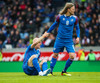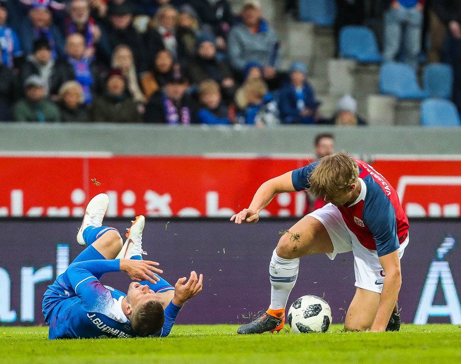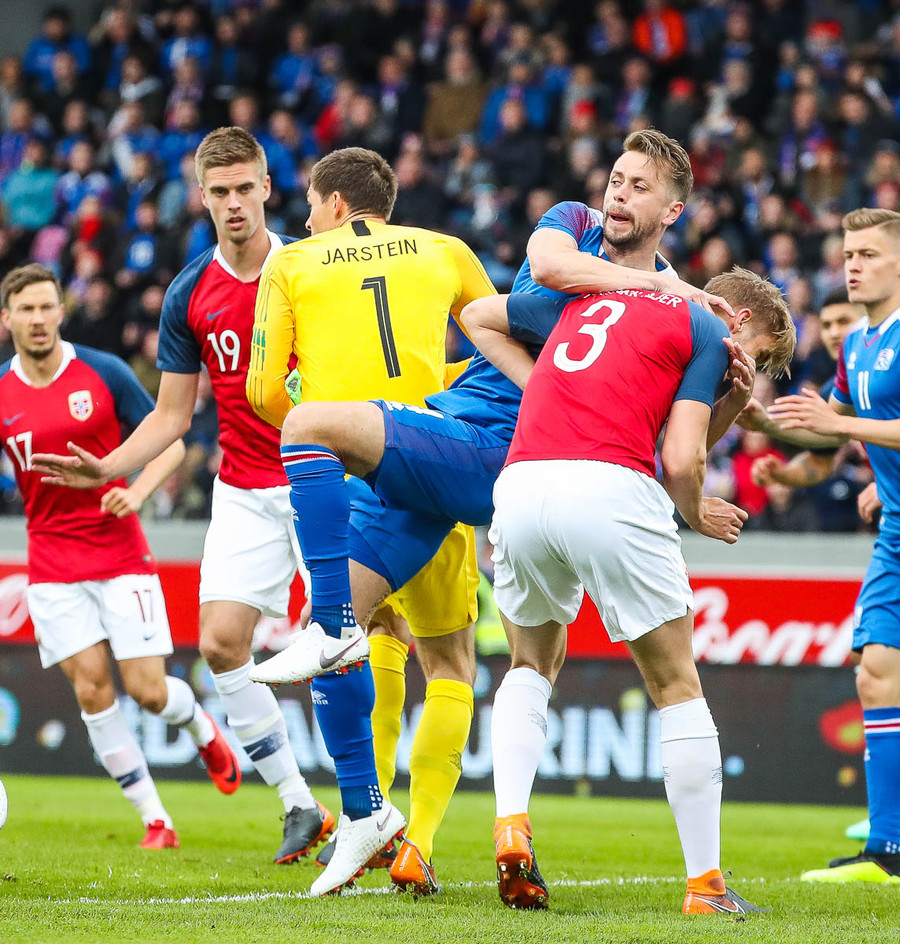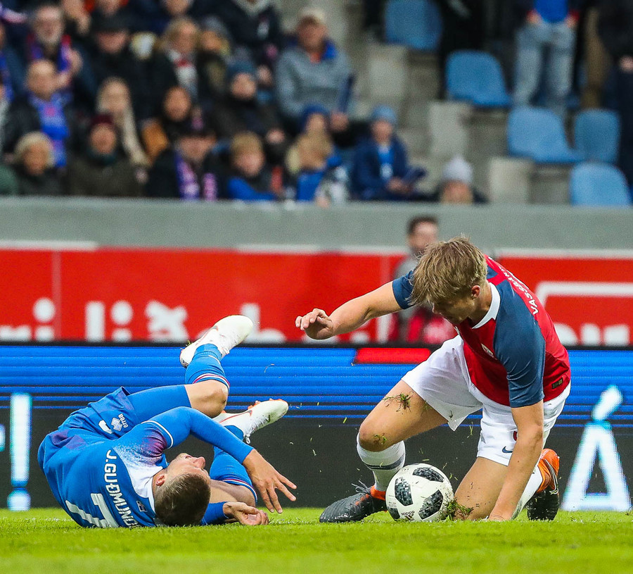 Jóhann Berg liggur meiddur eftir í teig Norðmanna eftir hressilega tæklingu. Á sama tíma bruna Norðmenn upp völlinn og Elyounoussi skýtur í samskeytin! Jóhann Berg stendur svo upp sem betur fer en er eitthvað að kveinka sér.