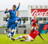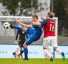 Markaskorarinn Björn Maars með hörkuskalla sem endar í þverslánni en búið að dæma á hann brot.