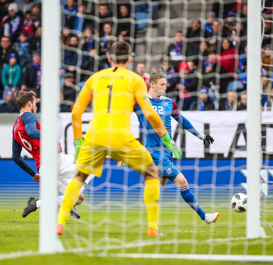 Þarna munaði litlu að Ísland bætti við marki!!! Birkir Már kom með stórhættulega fyrirgjöf og Havard Nordtveit var nálægt því að setja boltann í eigið net. Fyrir aftan hann var Björn Bergmann tilbúinn.
