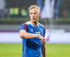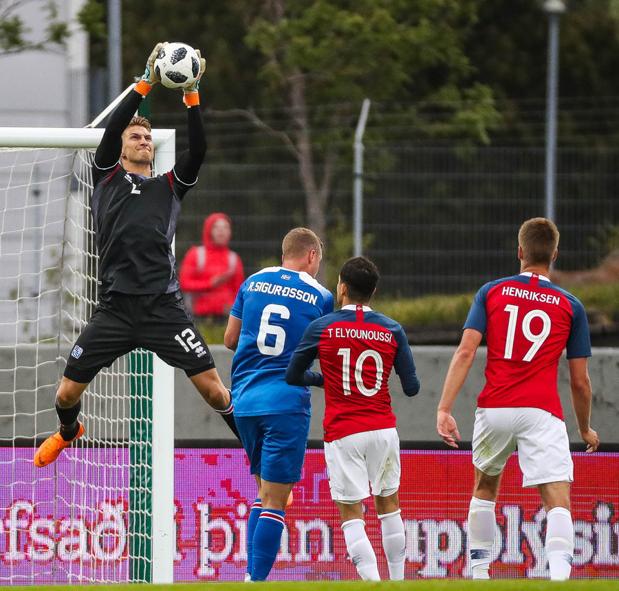 Frederik Schram er í marki Íslands í kvöld í leiknum gegn Noregi. Hannes Þór Halldórsson hefur verið að glíma við smávægileg meiðsli og er hann hvíldur í leiknum.