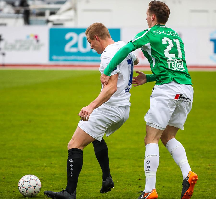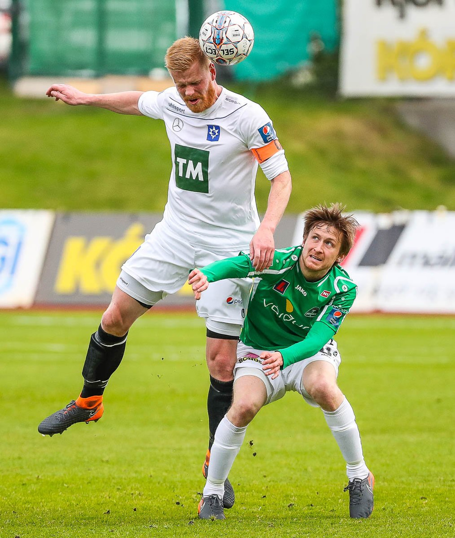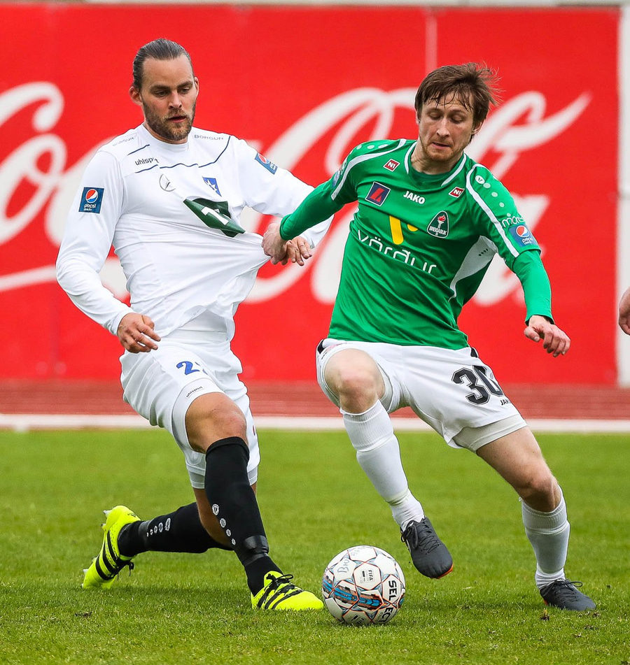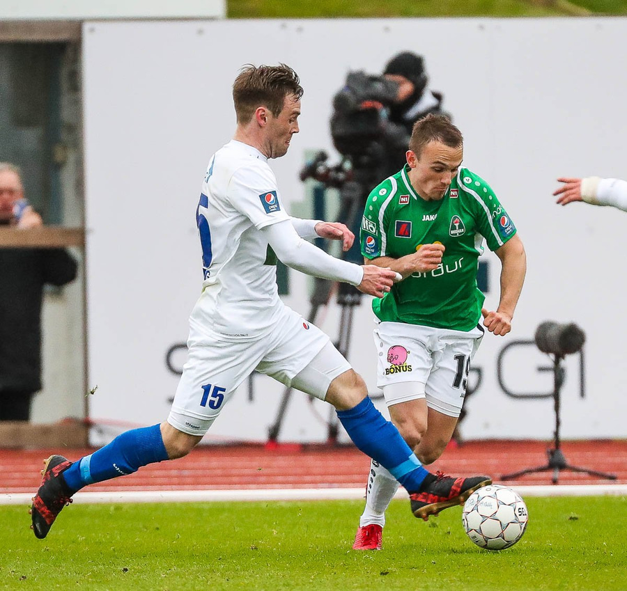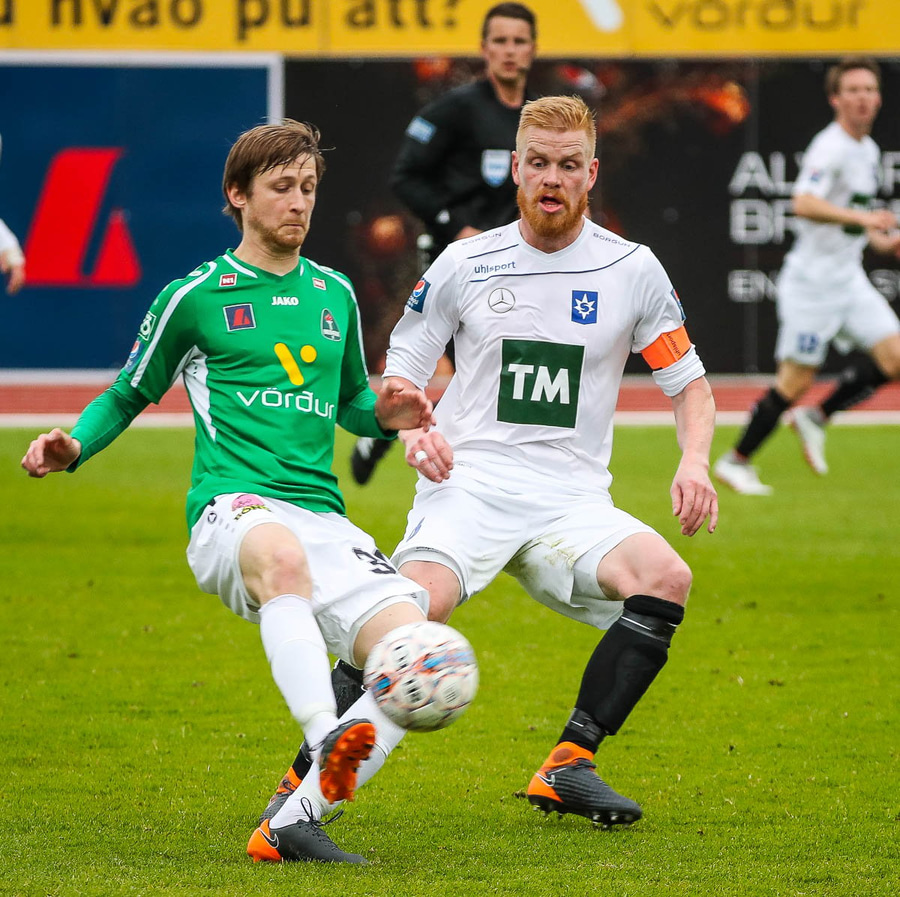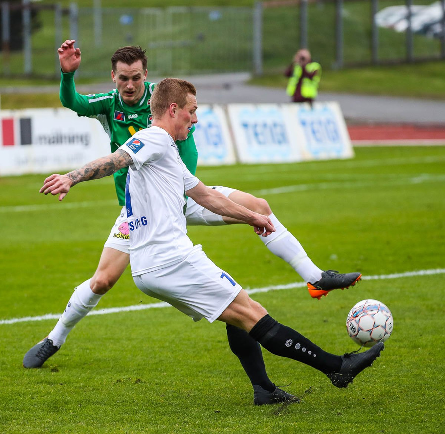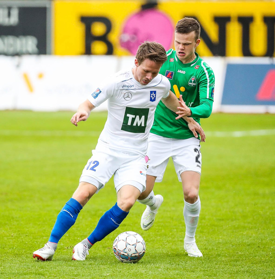Þórarinn Ingi brýtur hér á Arnþóri Ara úti á hægri kantinum þegar hann er að komast framhjá honum, hárrétt spjald.
