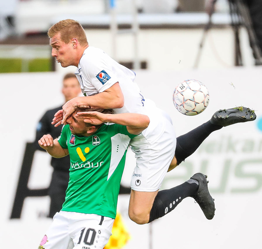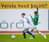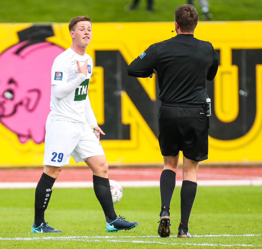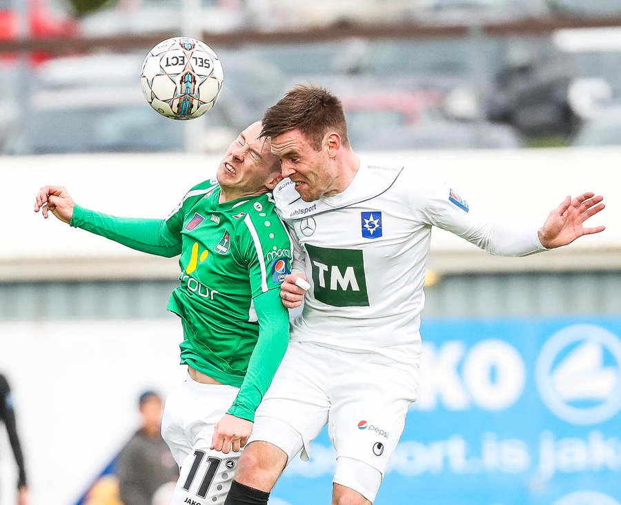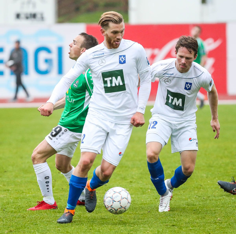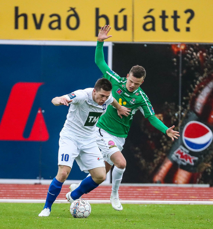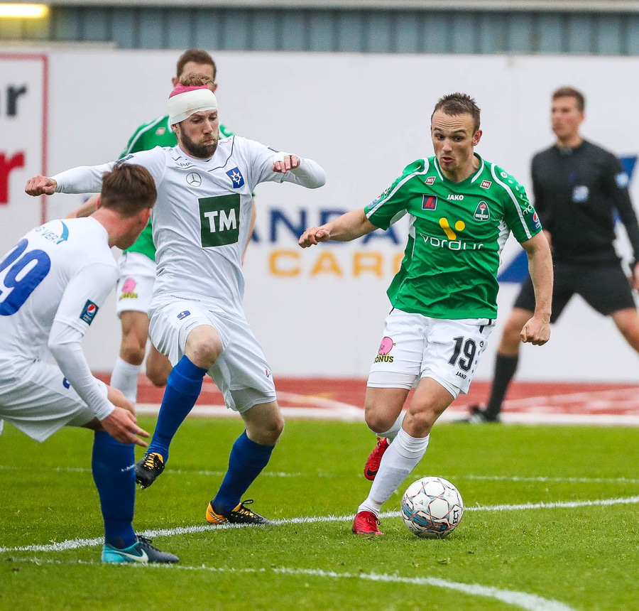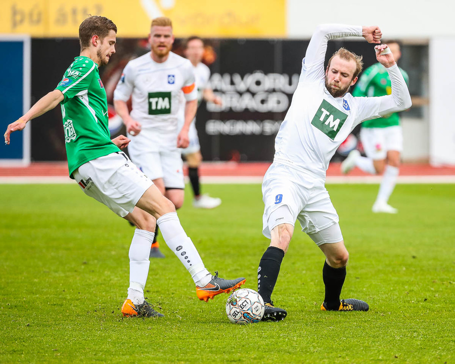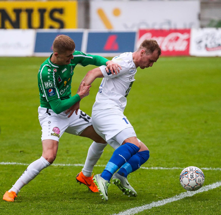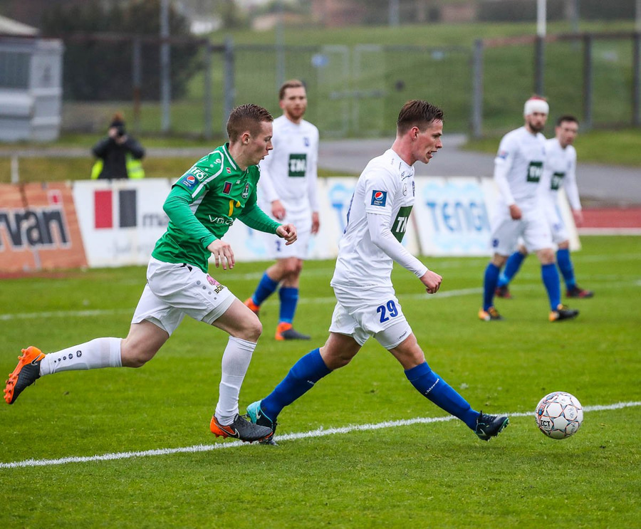 Þórarinn Ingi brýtur hér á Arnþóri Ara úti á hægri kantinum þegar hann er að komast framhjá honum, hárrétt spjald.