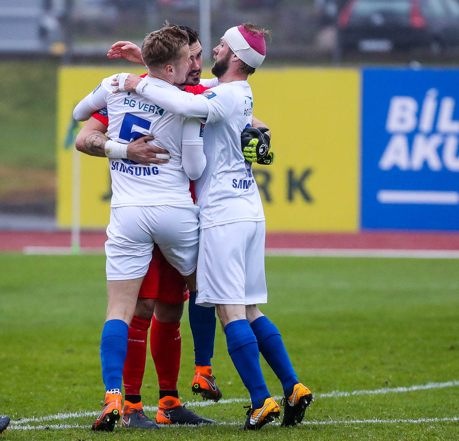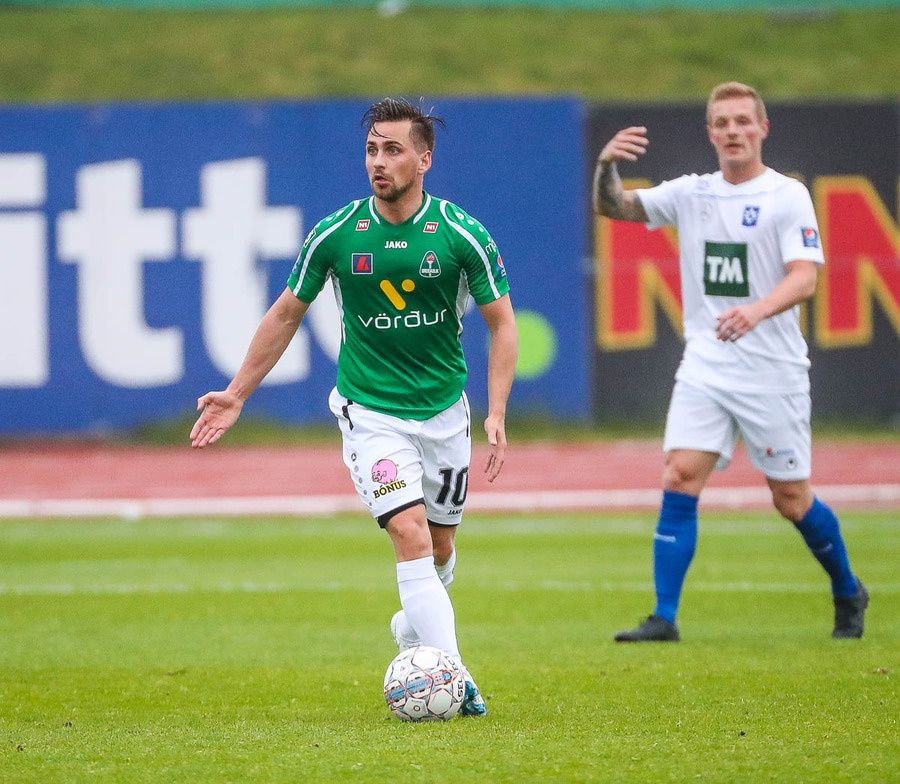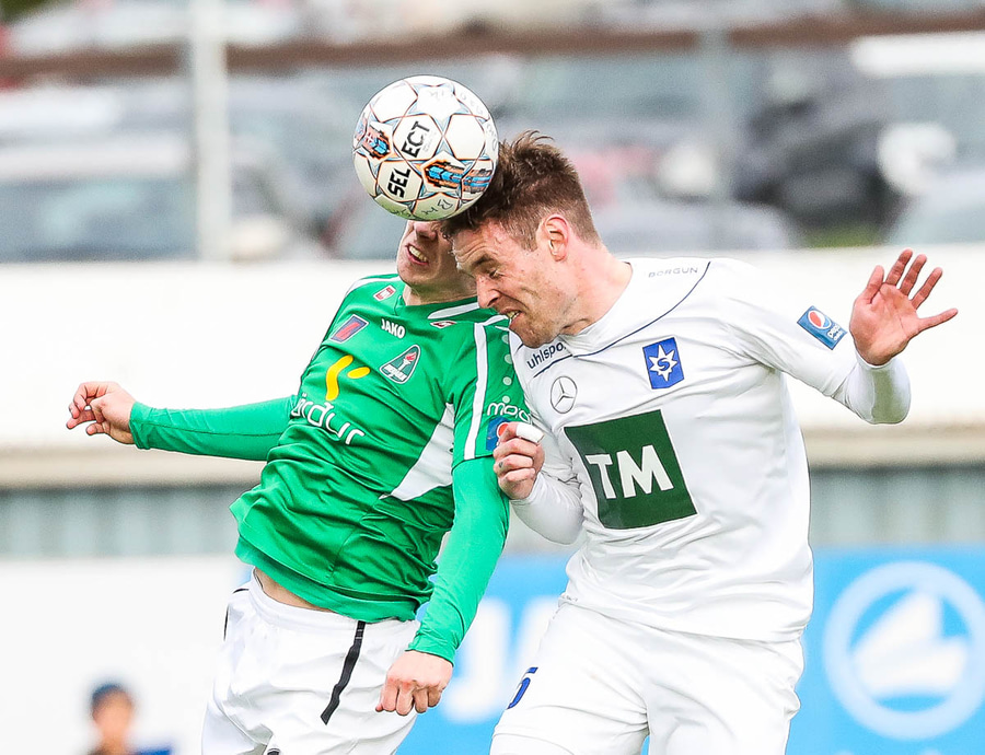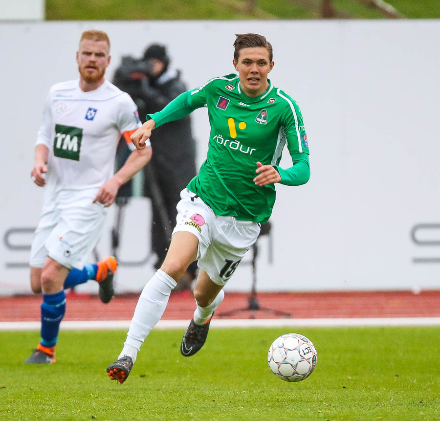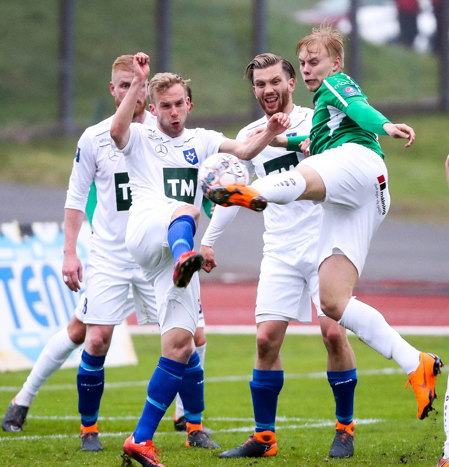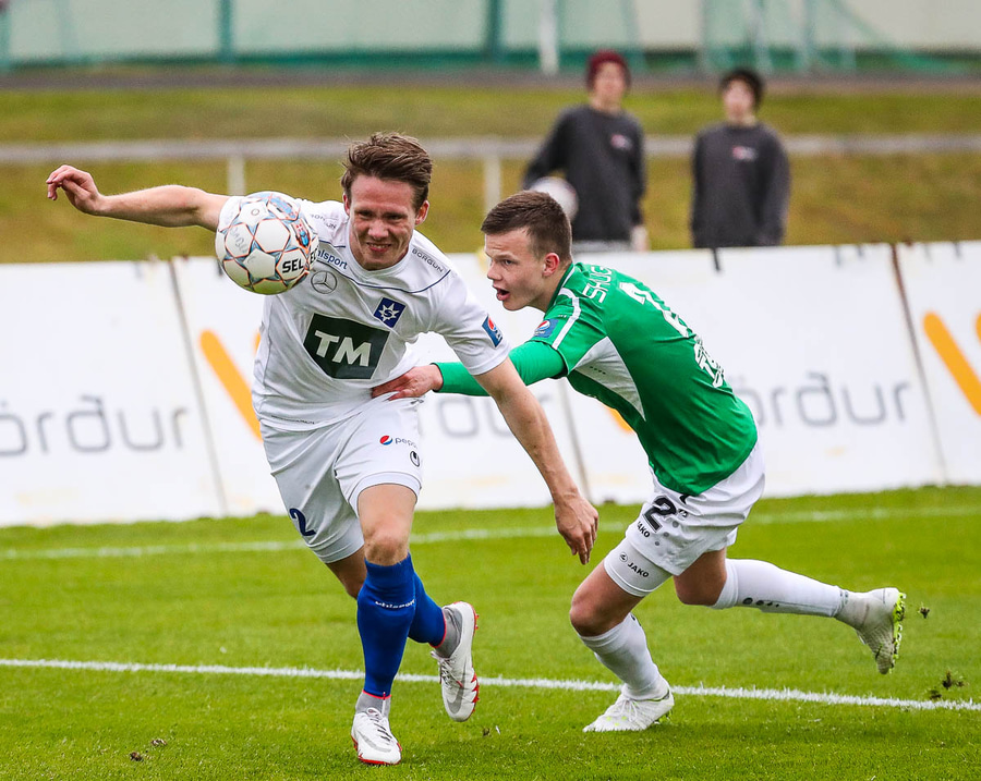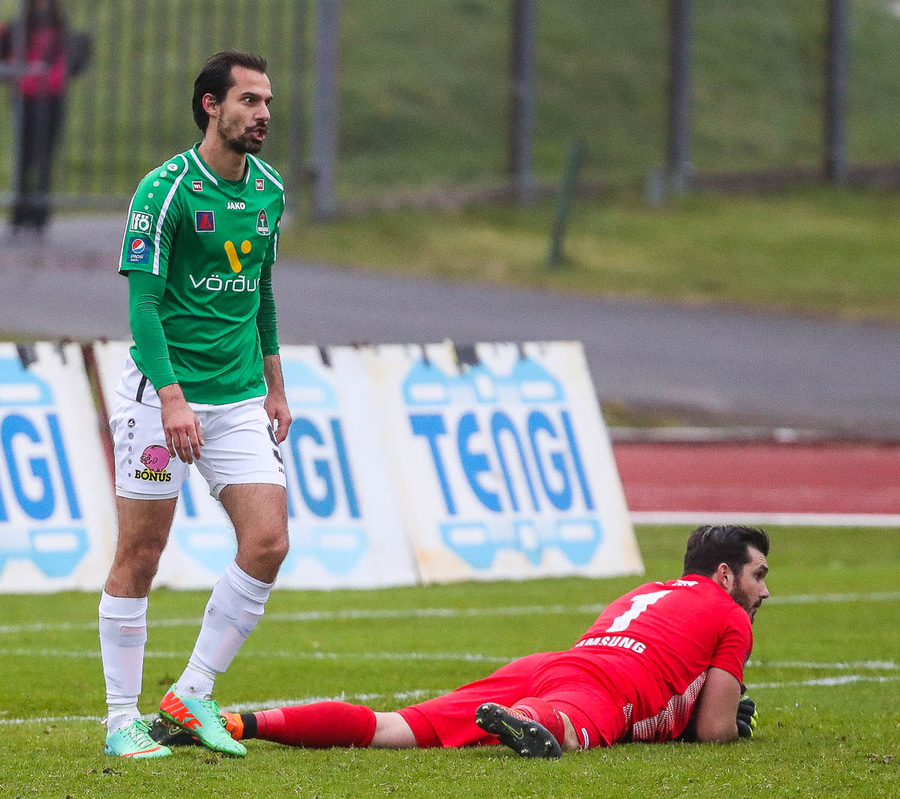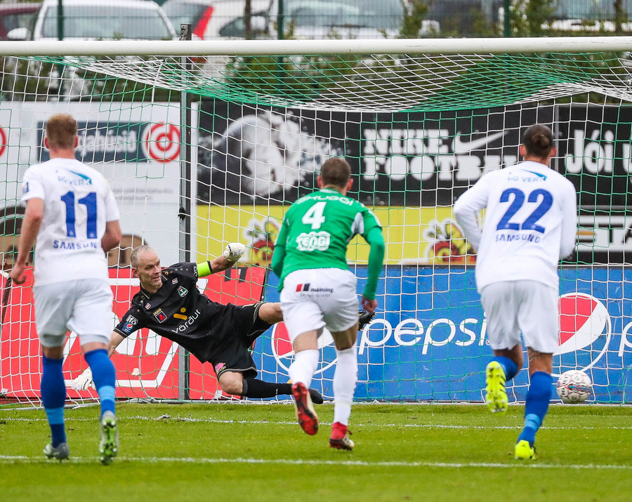 Vá, Arnþór einn á einn inn í teig á móti Tóta sem dettur en nær einhvern veginn að henda hausnum í boltann og moka honum í horn, stórkostleg björgun hjá Tóta!