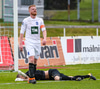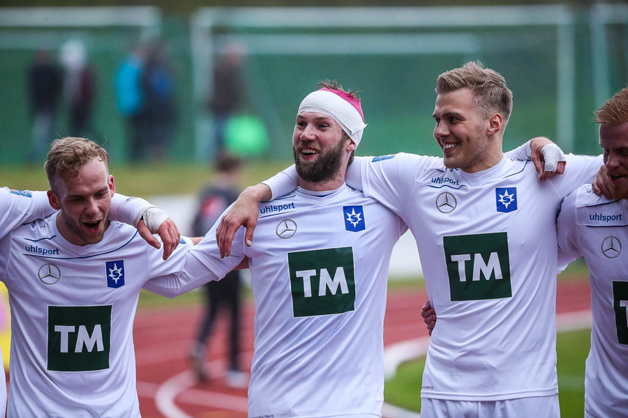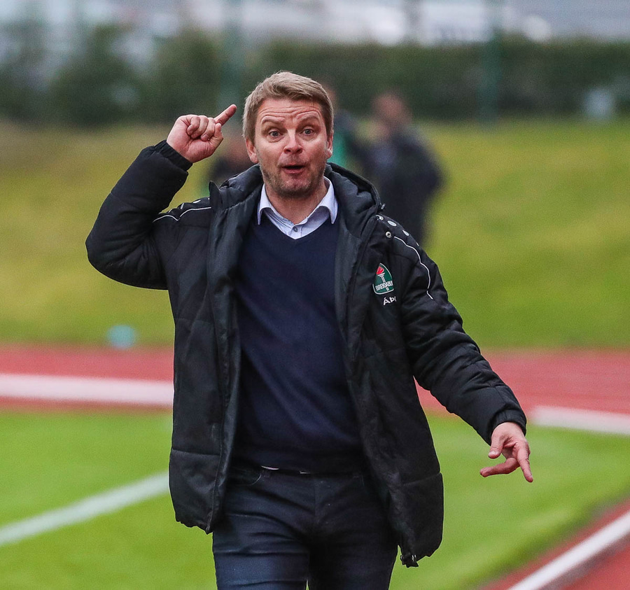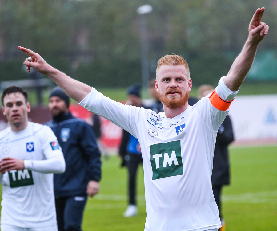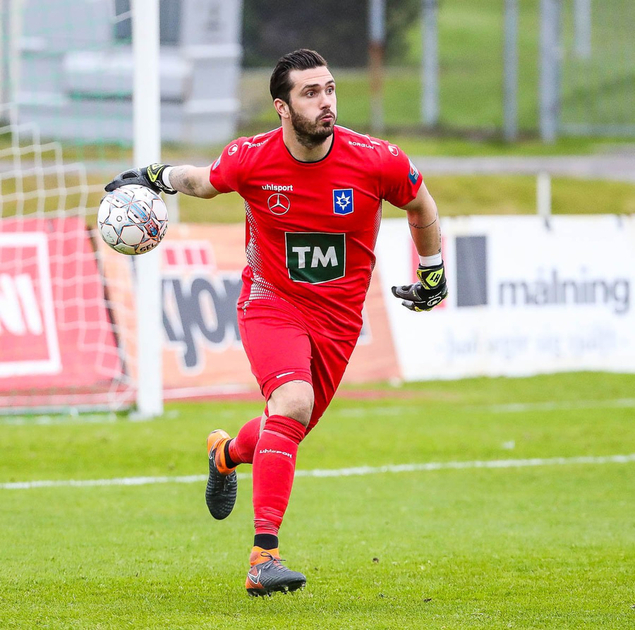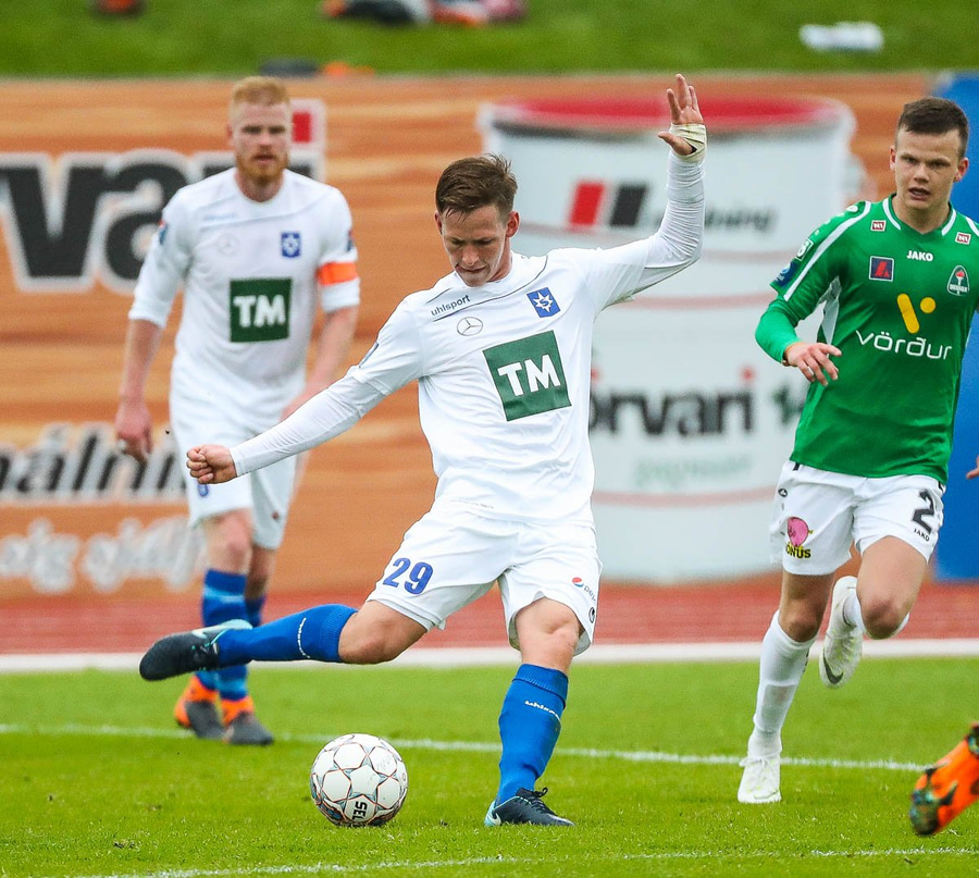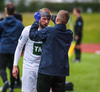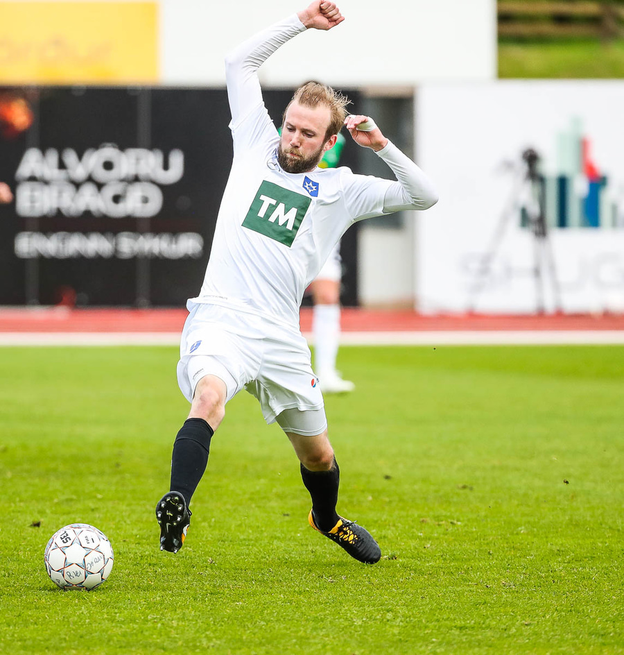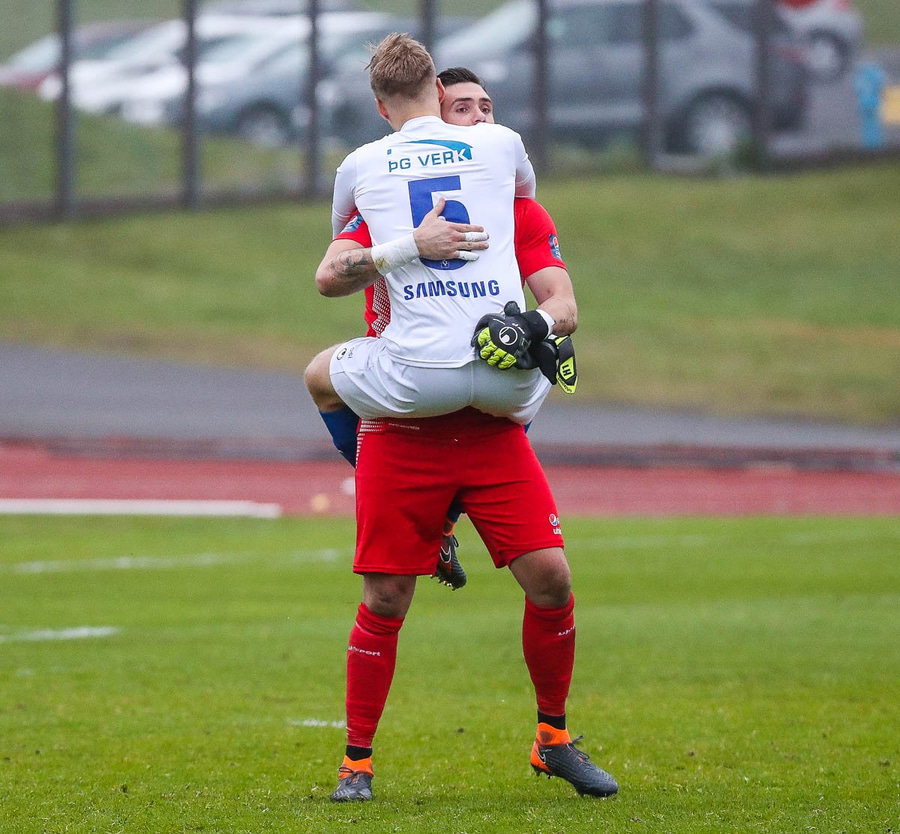 Vá, Arnþór einn á einn inn í teig á móti Tóta sem dettur en nær einhvern veginn að henda hausnum í boltann og moka honum í horn, stórkostleg björgun hjá Tóta!