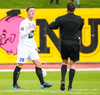 Sveinn Aron og Brynjar Gauti fara hérna upp í skallabolta og Brynjar liggur eftir og Vilhjálmur dæmir aukaspyrnu og gult spjald á Svein. Í fyrsta lagi er ég ekki viss um að Sveinn braut og þetta er þá allavega aldrei spjald!