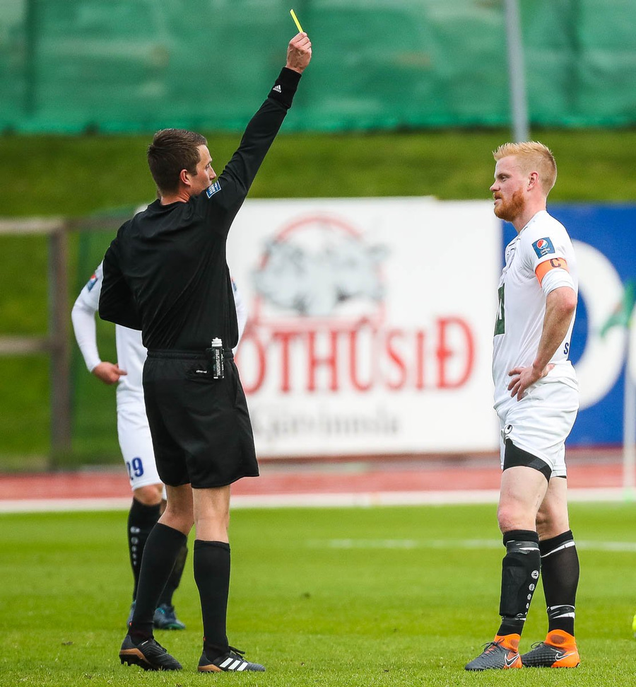 Er of seinn í tæklingu á Gísla á miðjum vellinum og verðskuldar þetta spjald.