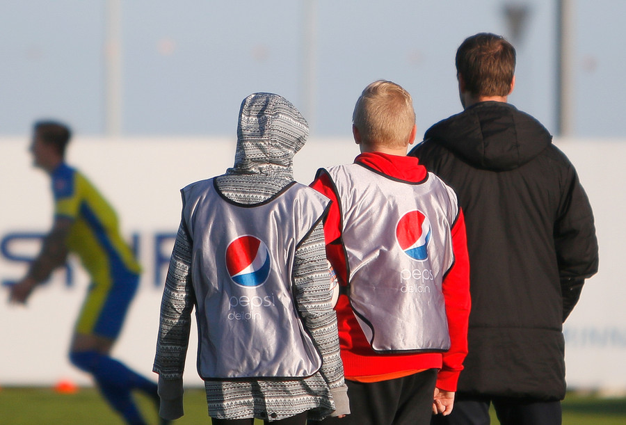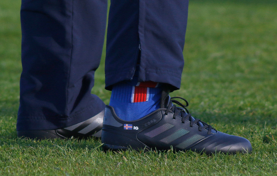 Völlurinn hefur verið vel vökvaður hér fyrir leik því stór hluti leikmanna á vellinum hefur runnið á rassinn í það minnsta einu sinni í leiknum