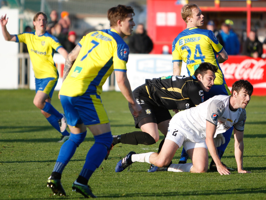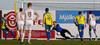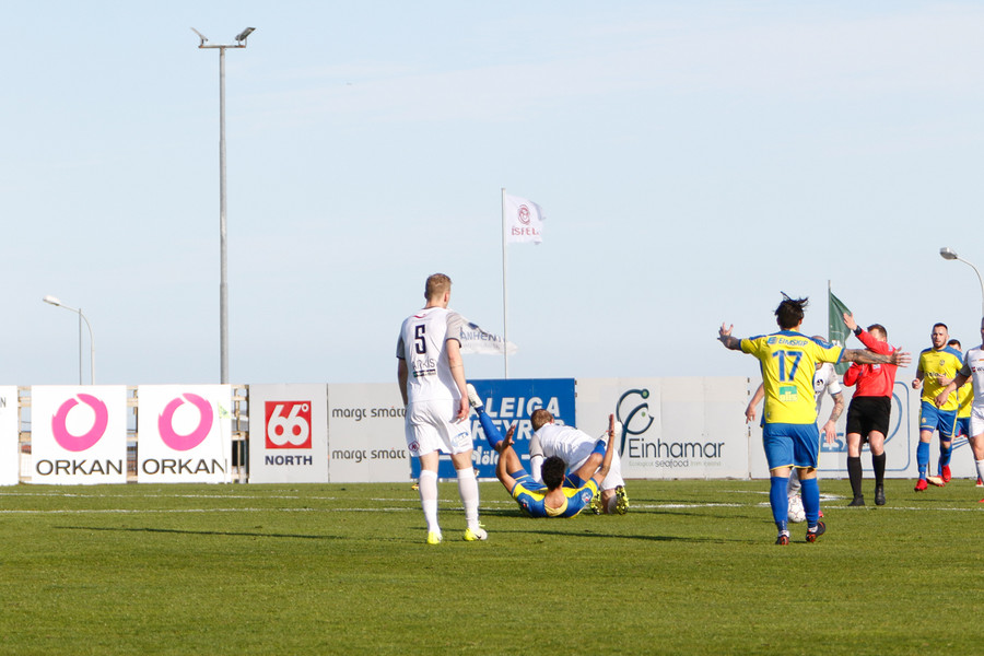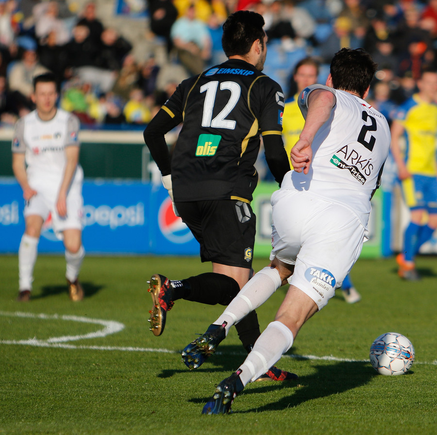 Ái þetta hefur verið vont. Ari Leifsson rennur þegar hann spyrnir boltanum fram. Jóhann Helgi reynir að komast fyrir sendinguna og lendir á lærinu á honum með takkanna. óviljaverk