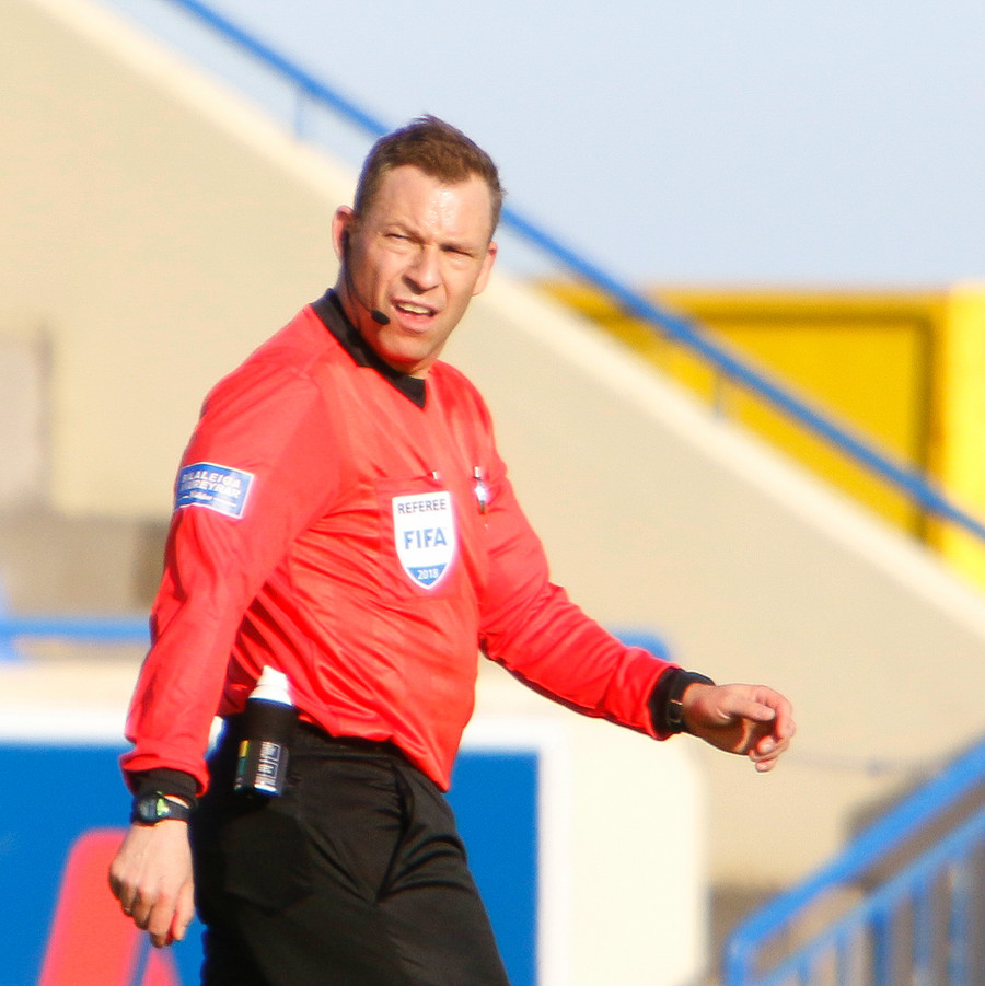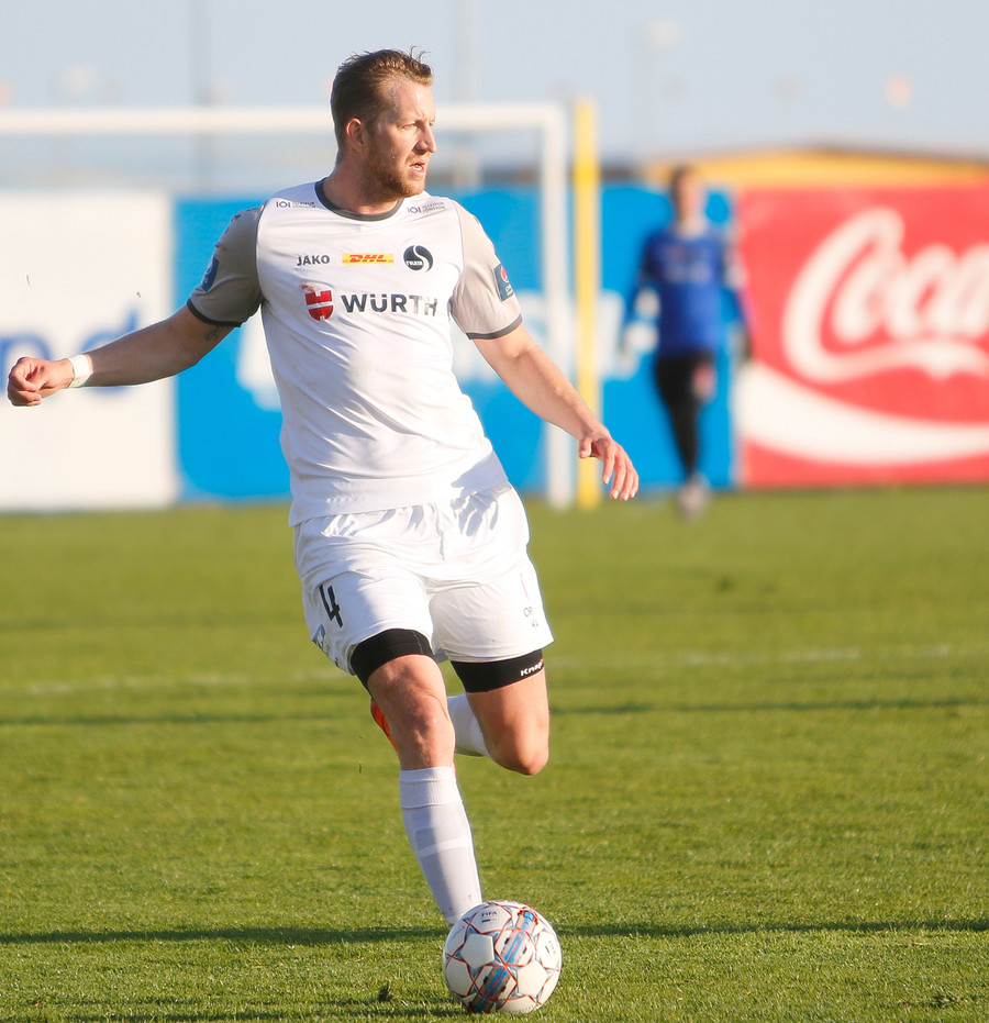 Helgi Valur brýtur á Rodrigo sem ýtir aðeins við honum þegar hann stendur upp. Helgi brosir