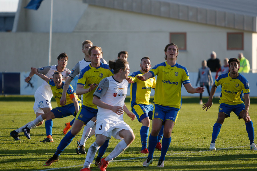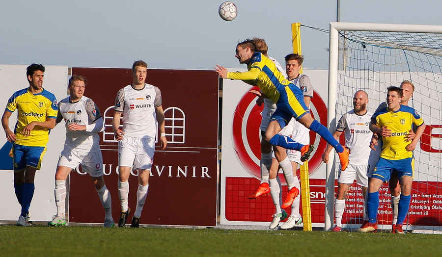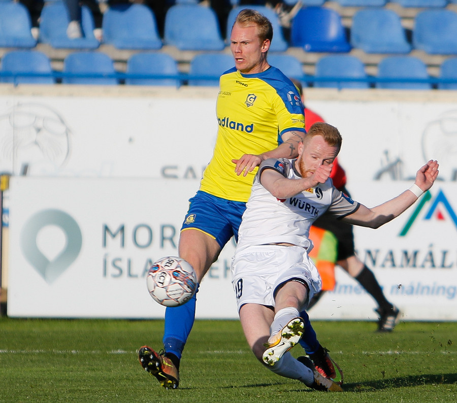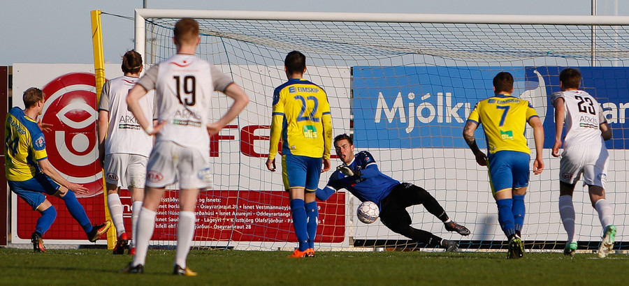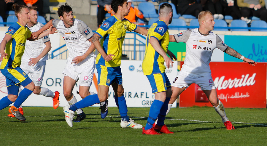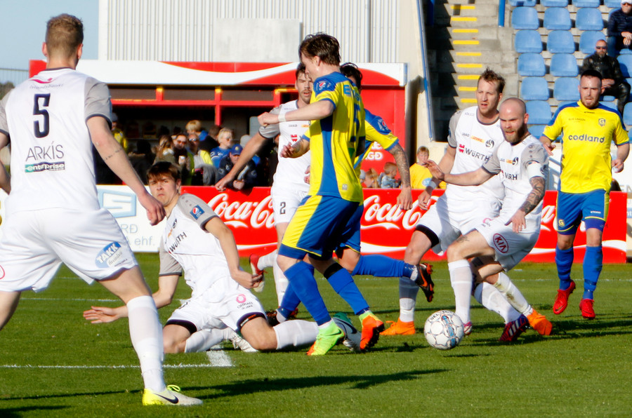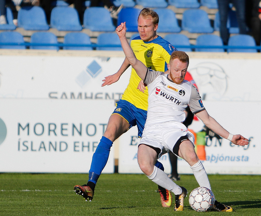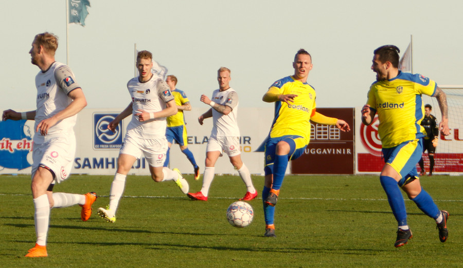 Gunnar og Björn Berg rekast hér saman og Hákon Ingi fær boltann rétt fyrir utan teig með Jajalo af línunni. Hákon reynir að lyfta boltanum yfir Jajalo en yfir markið