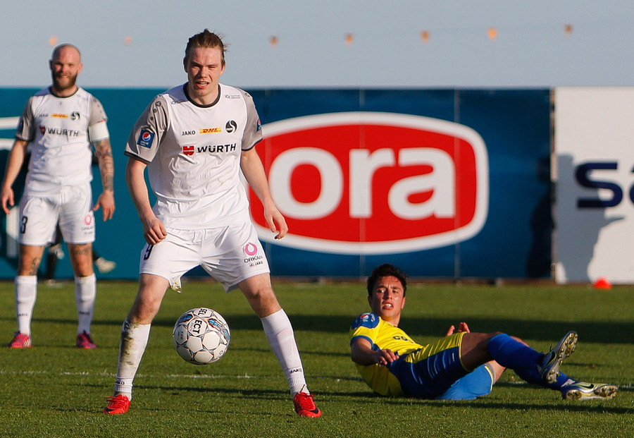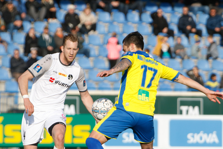 Ragnar Bragi þræðir boltann á Hákon sem á í kapphlaupi við Brynjar um boltann og er á undan og nær skotinu en rennur og Jajalo á ekki í vandræðum með það.