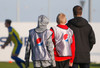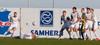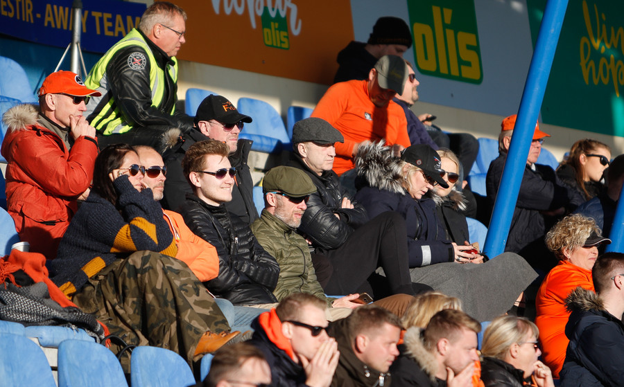 Fer að styttast í þetta og liðin að klára upphitun. Eitthvað af fólki að týnast í stúkuna og vonandi að hún verði vel setin í kvöld enda aðstæður allar til fyrirmyndar.
