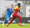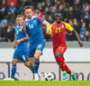 Raphael Dwamena liggur innan teigs eftir barning við Ragga Sig en Bobby Madley lætur leikinn halda áfram og Ísland vinnur boltann.