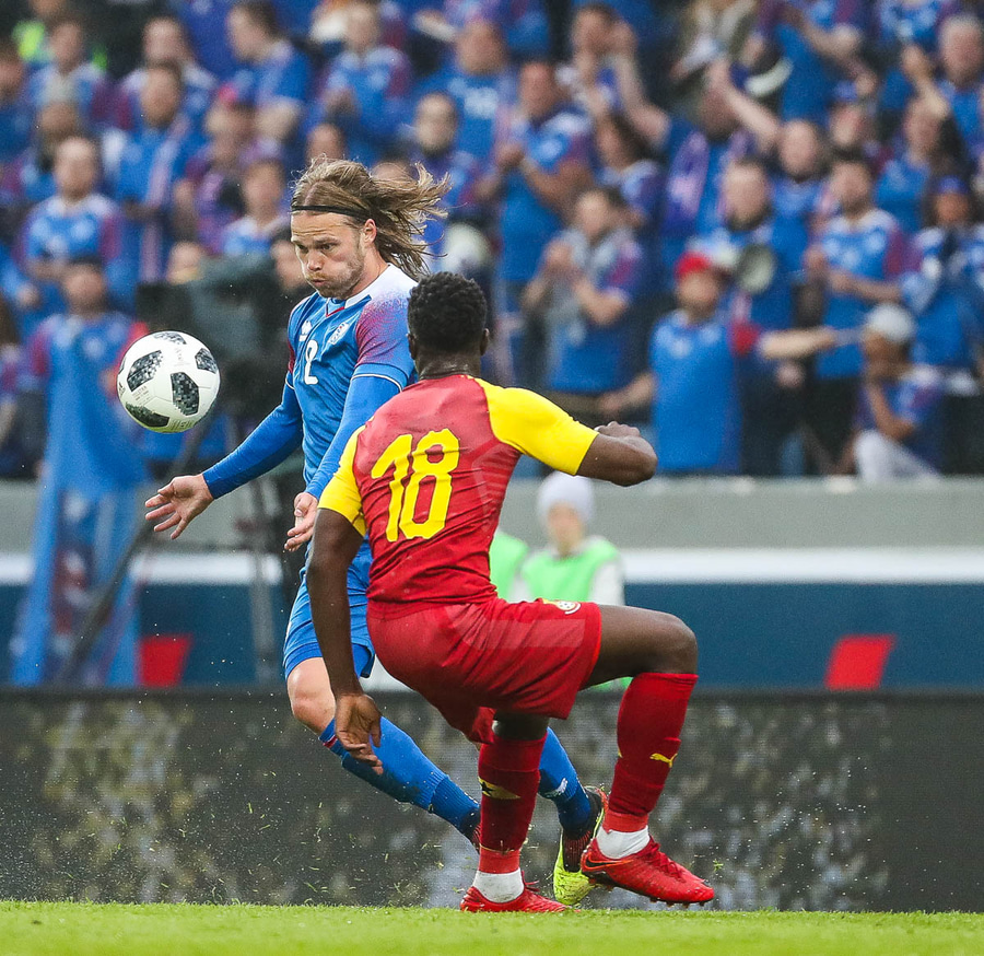 Björn Bergmann með fyrirgjöf en enn og aftur er það Nicholas Opoku sem kemur Ganverjum til bjargar og boltinn aftur fyrir. Íslendingar fá horn.