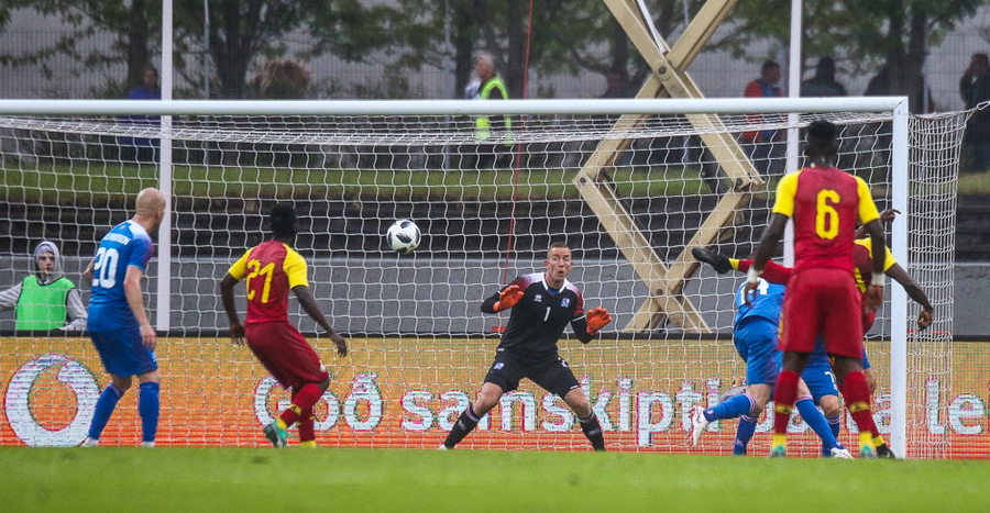 Andy Yiadom tók þrjár hornspyrnur Gana í röð en á endanum nær Kári Árnason að skalla boltann í burtu.