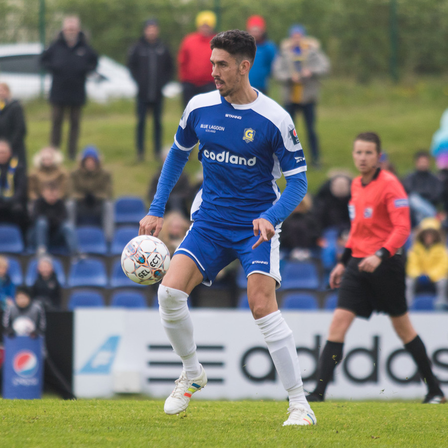 Brýtur á Birni þegar hann keyrir upp í skyndisókn eftir hornspyrnu Grindvíkinga. Aukaspyrnan er á stórhættulegum stað á vítateigslínunni.