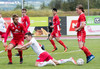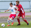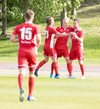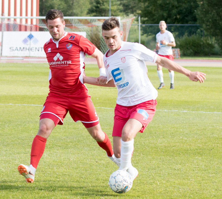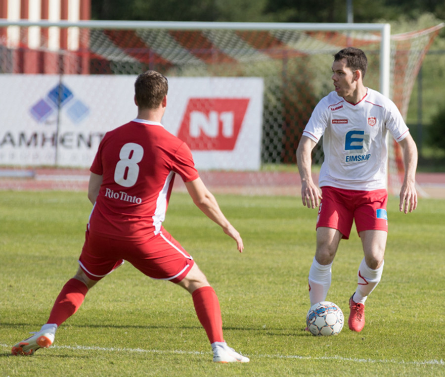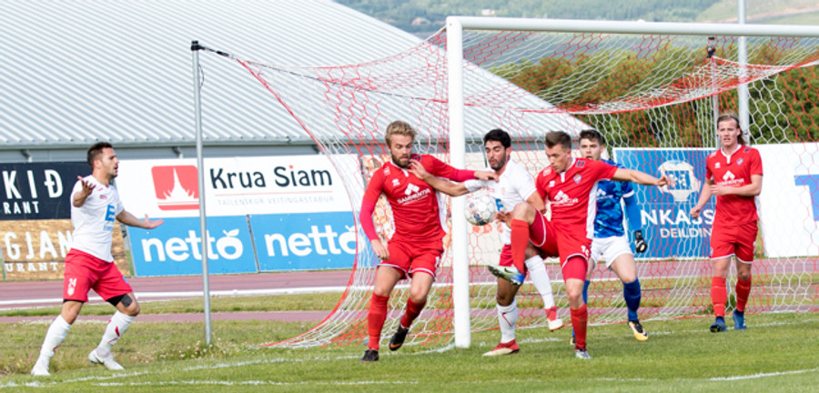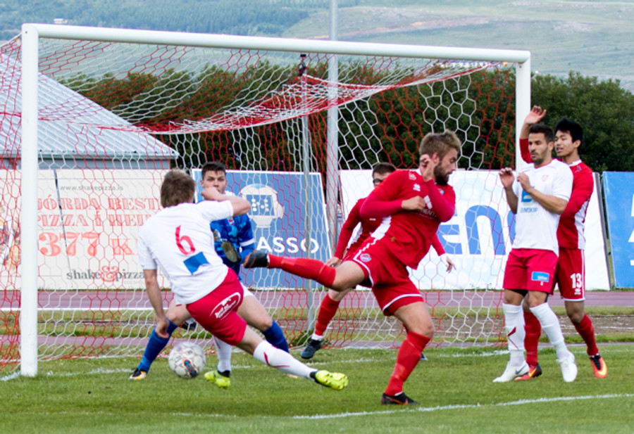 Óskar Elías með góðan bolta inn í teig, Sveinn Elías tekur við honum og setur boltann út á Jónas sem er í góðri stöðu í teignum en skýtur beint í varnarmann