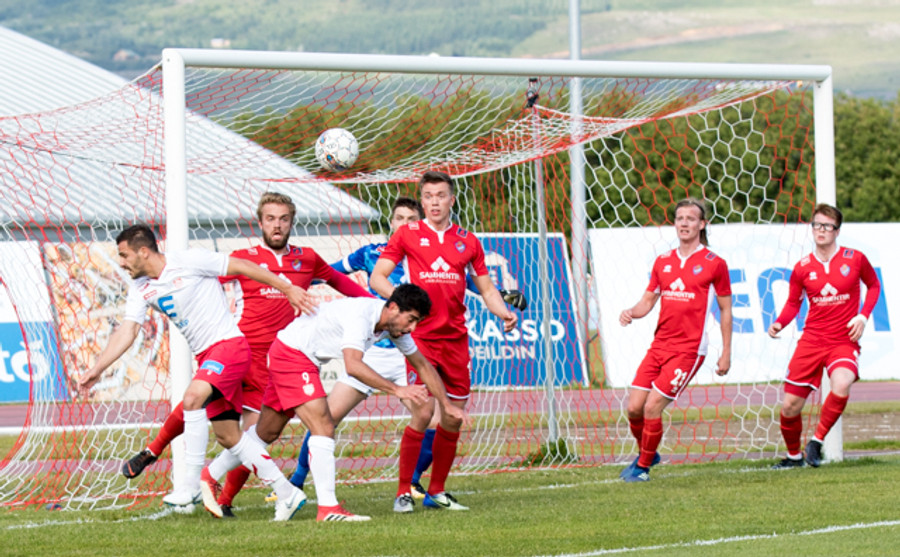 Aftur komast Þórsarar upp völlinn og setja boltann fyrir markið en hann fer í gegnum allan pakkann og útaf hinum meginn