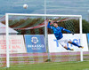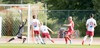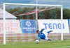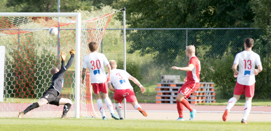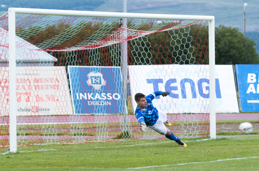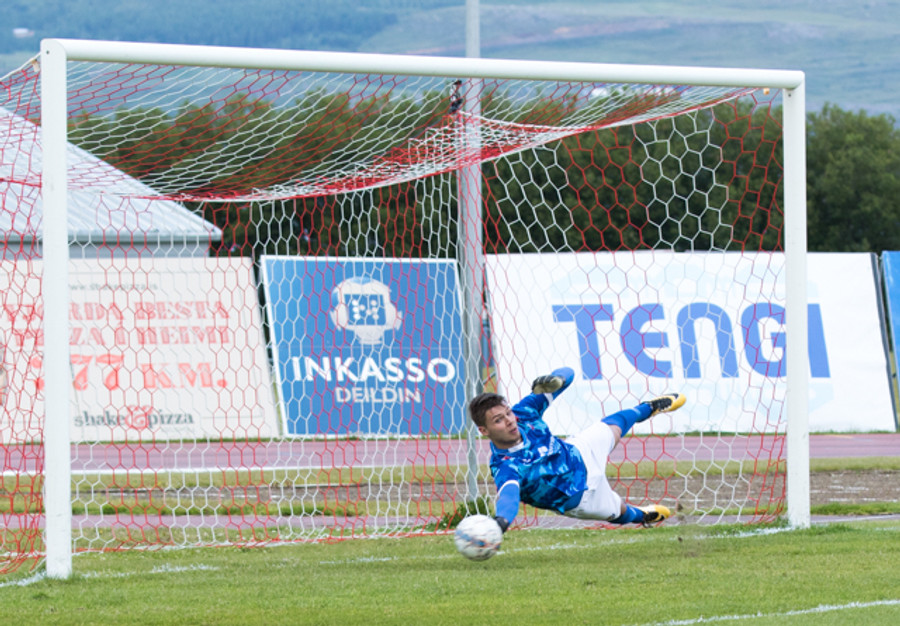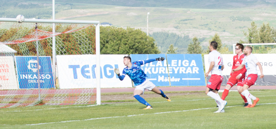 Setur boltann reyndar alveg út við stöng vinstra meginn en spyrnan er laflaus og Jökull skutlar sér auðveldlega á boltann