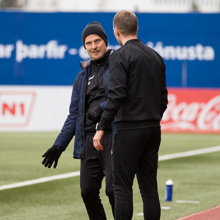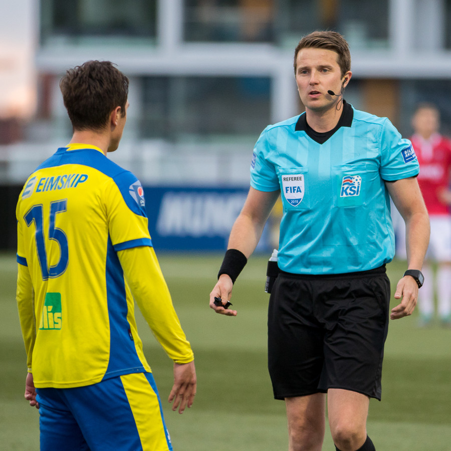 Smiðurinn segir ungu mönnunum í dómaratreyjunum til synda. Þeir eru yfirvegaðir, Ívar fær duglegt spjall bara.