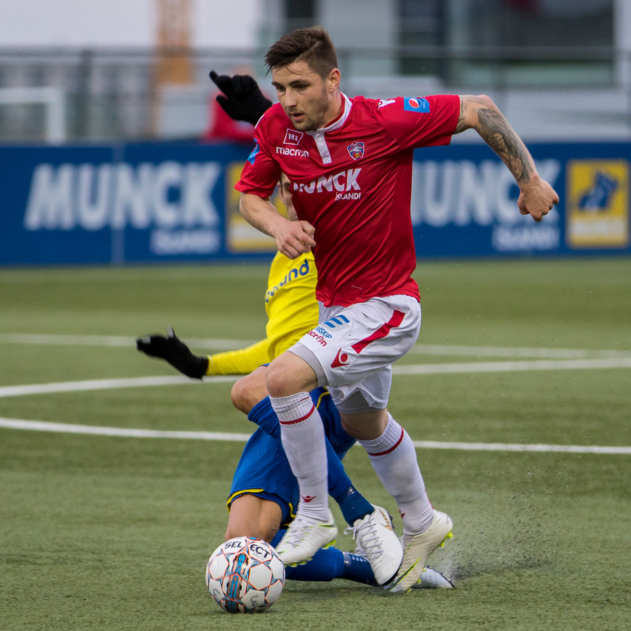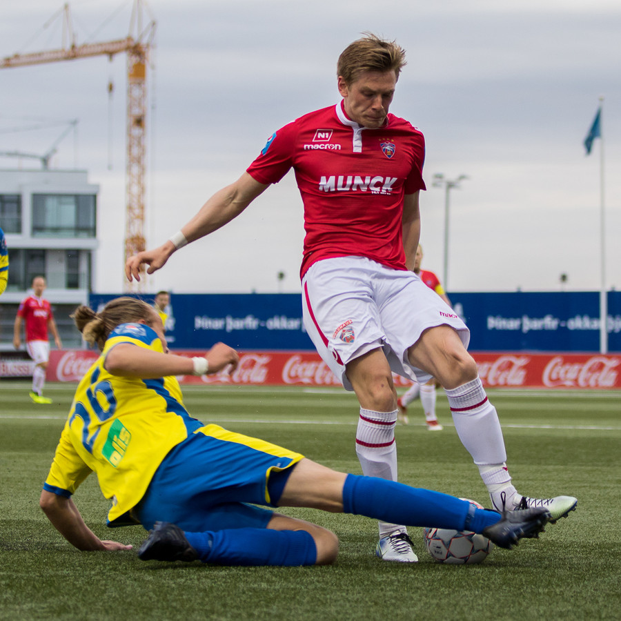Pedersen í fínu skotfæri eftir upphlaup Sigurðar Egils en tekur aukasnertingu þannig að varnarmaðurinn lokar á og skotið verður lint.