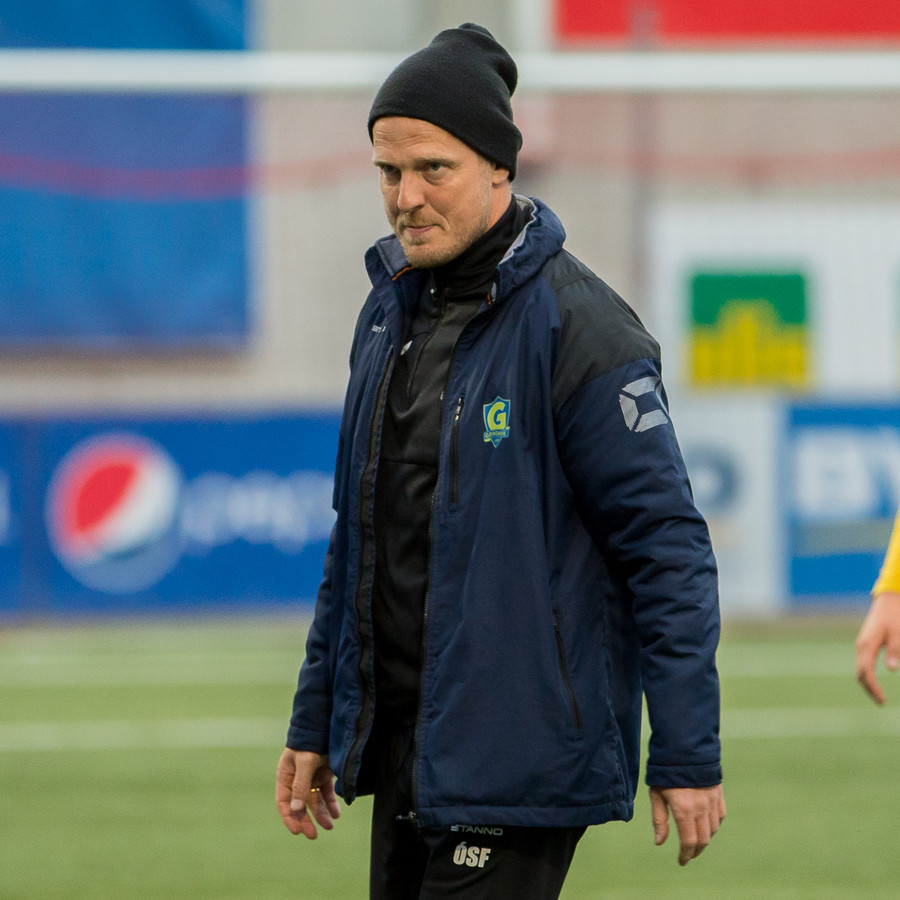 Óli Jó vill víti hérna segir boltann hafa farið í hönd Grindvíkings í rennitæklingu.