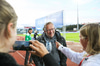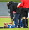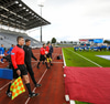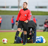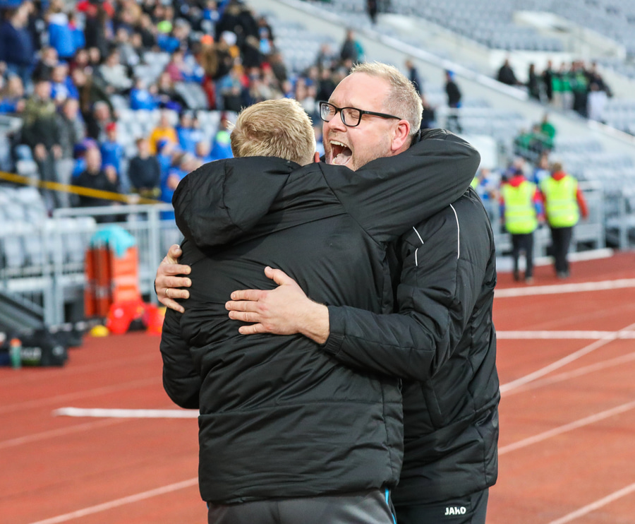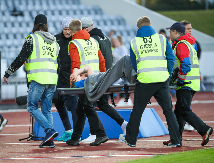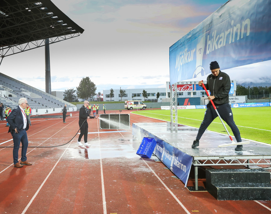 Það er fínasta fótboltaveður. Létt skýjað og svolítil gola. Laugardalsvöllur skartar sínu fegursta.