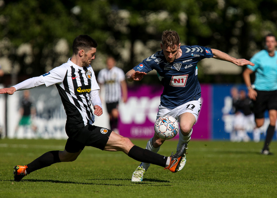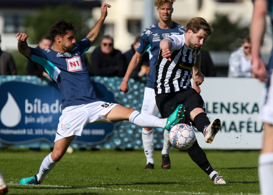 Halldór kominn langt út og Óskar reynir chippuna en Halldór kemst tilbaka og nær valdi á boltanum.