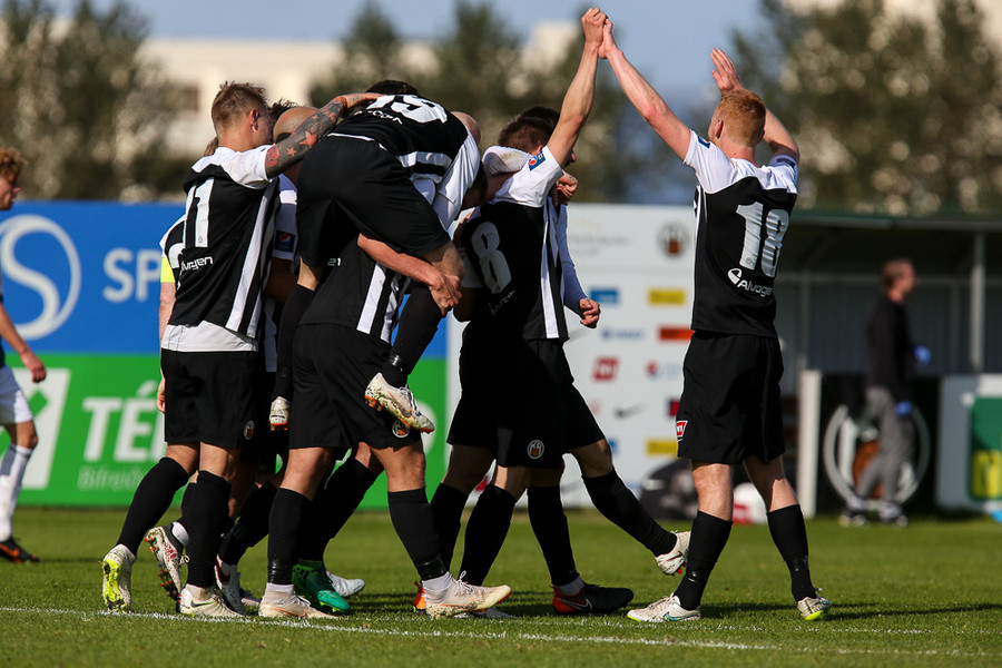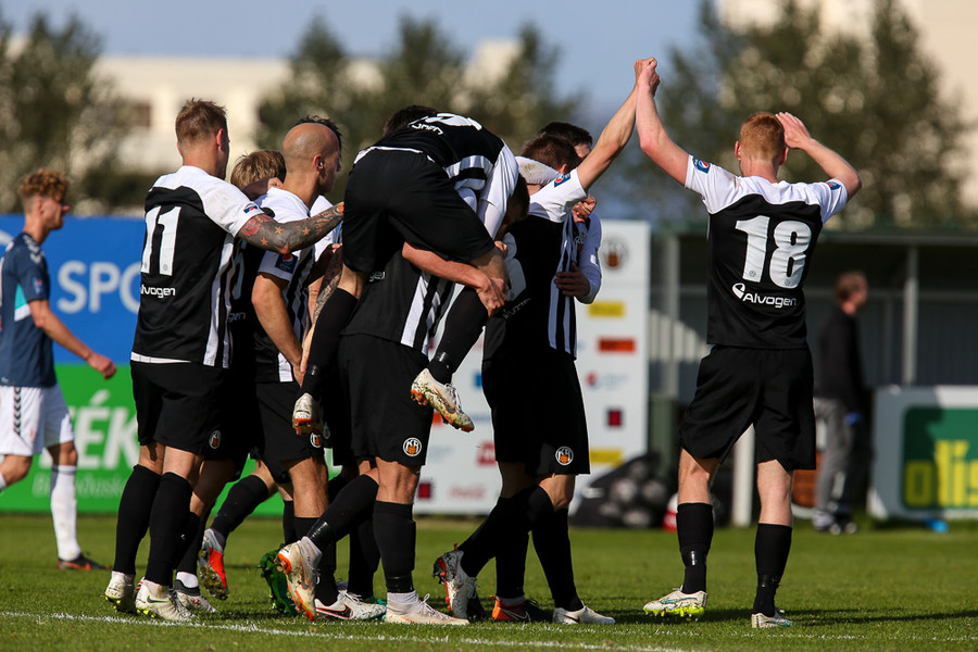 Skemmtileg útfærsla af aukaspyrnu, Óskar lyftir honum á Kennie sem leggur hann fyrir Bjögga sem hamrar boltanum í hliðarnetið.