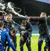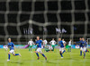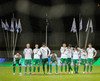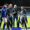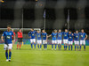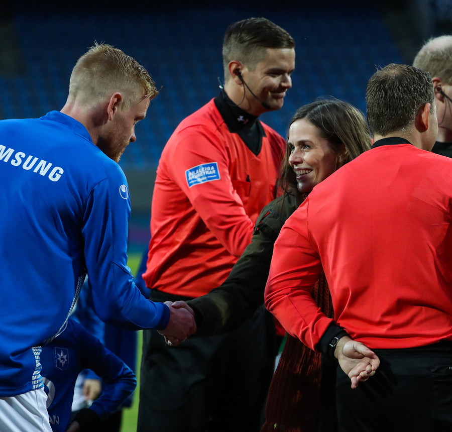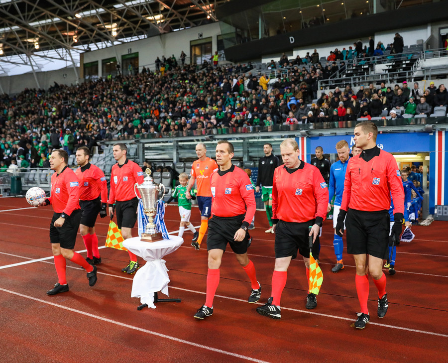 Liðin ganga nú á inná völlinn við mikinn fögnuð áhorfenda, Þóroddur Hjaltalín og hans teymi leiða línuna, þetta fer að byrja!