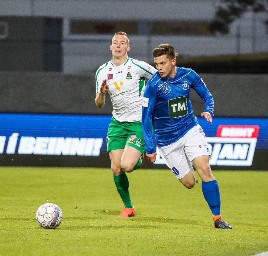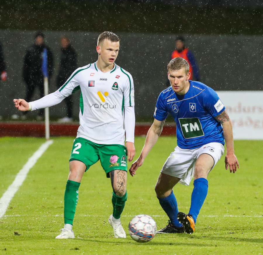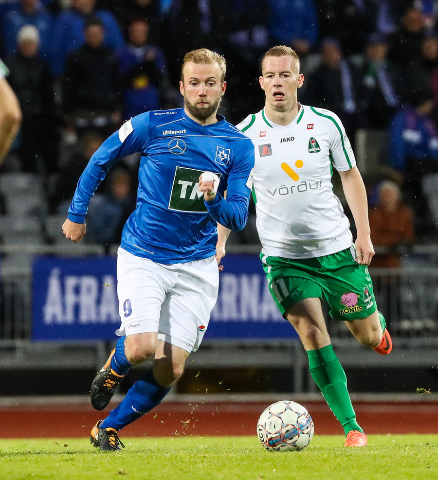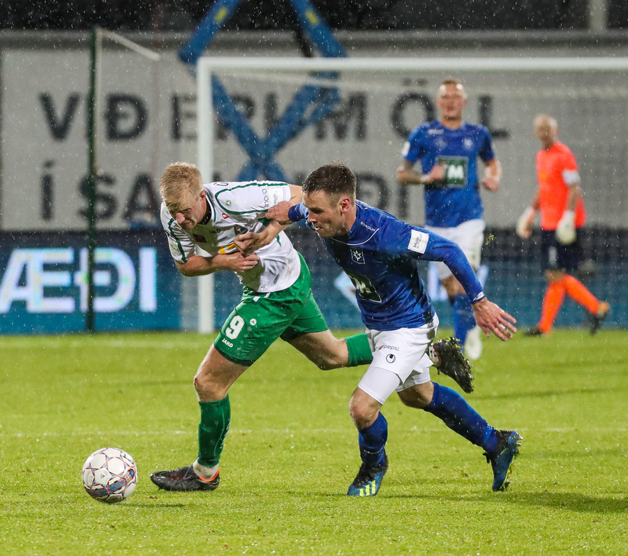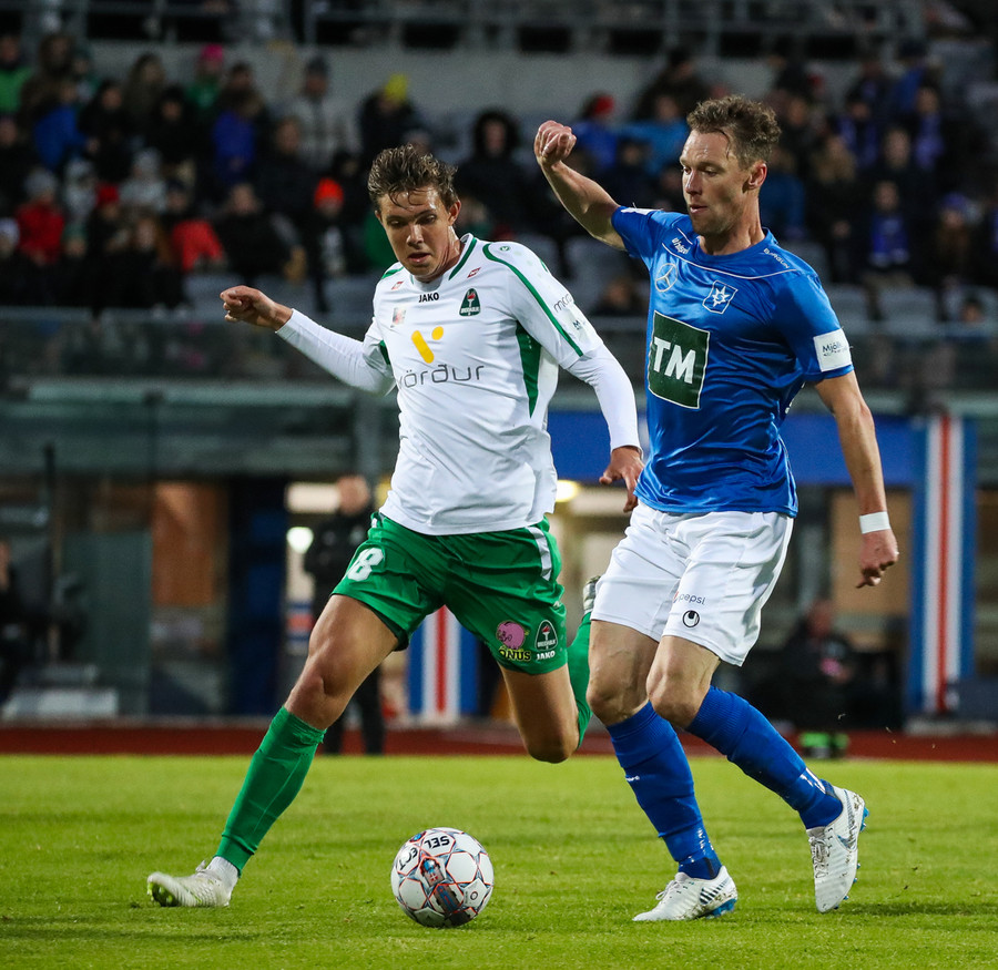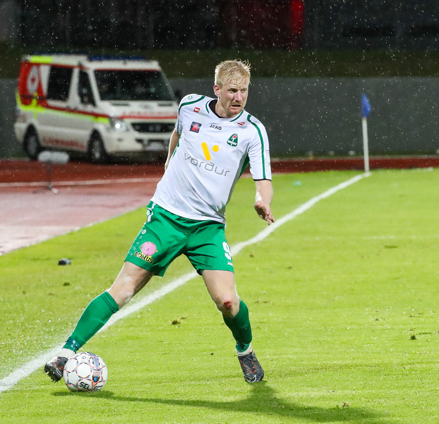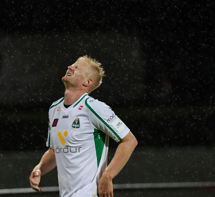 Þorsteinn Már á leiðinni upp kantinn en Davíð nær að trufla hann og fyrirgjöf Þorsteins er ömurleg, beint útaf.