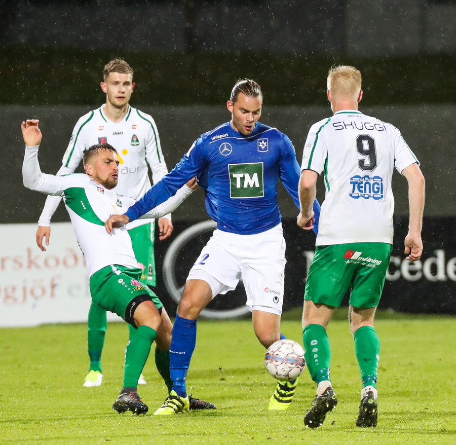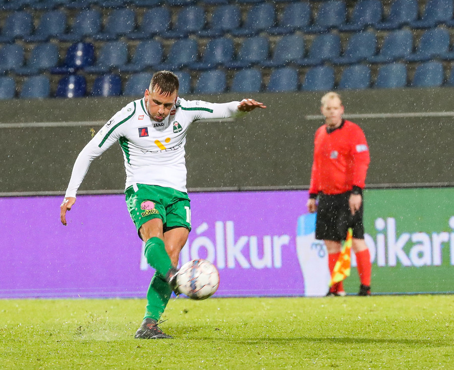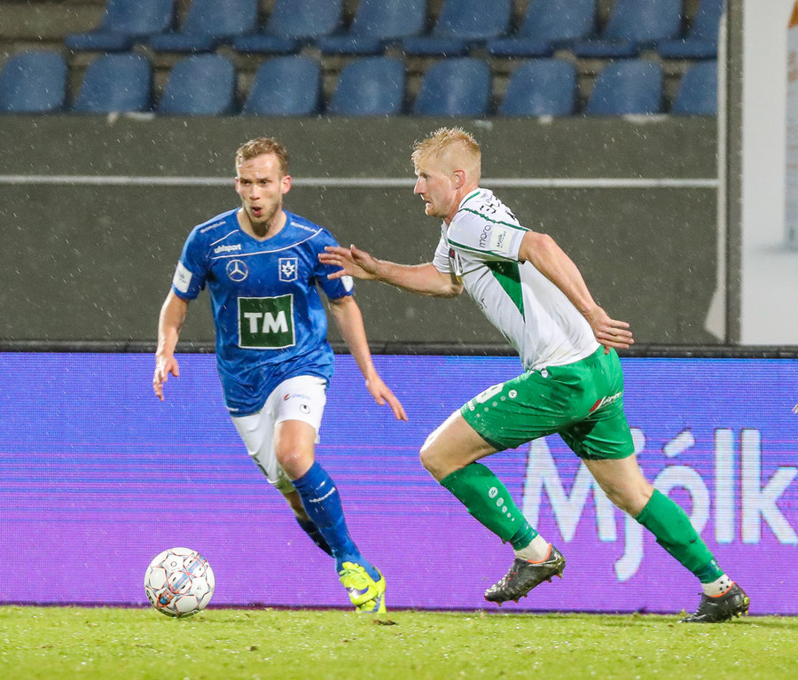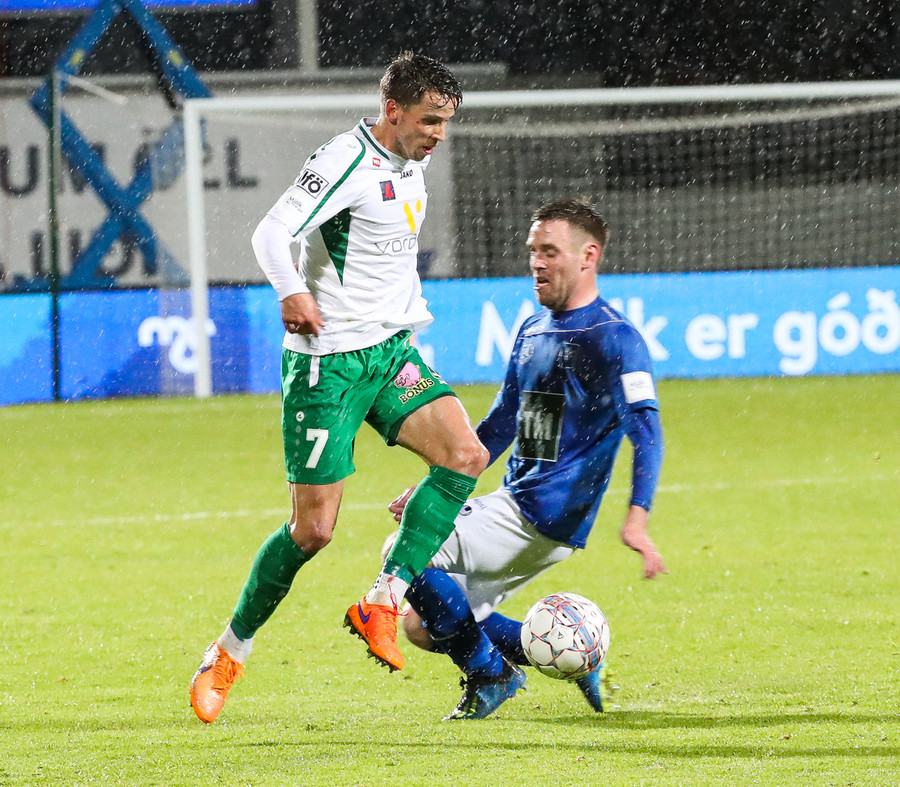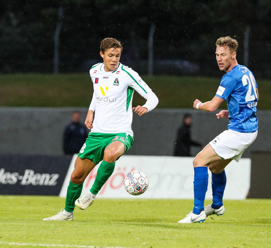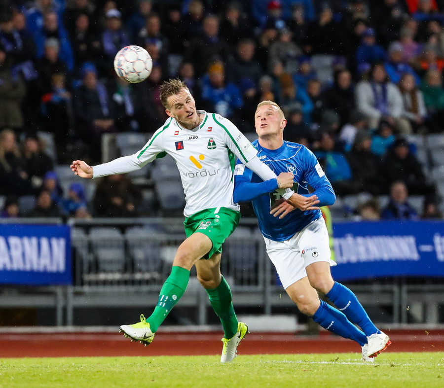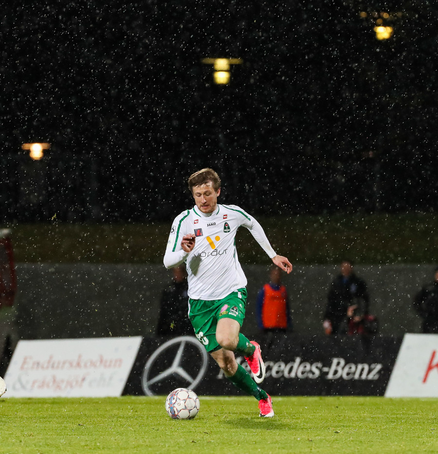 Þorsteinn Már á leiðinni upp kantinn en Davíð nær að trufla hann og fyrirgjöf Þorsteins er ömurleg, beint útaf.