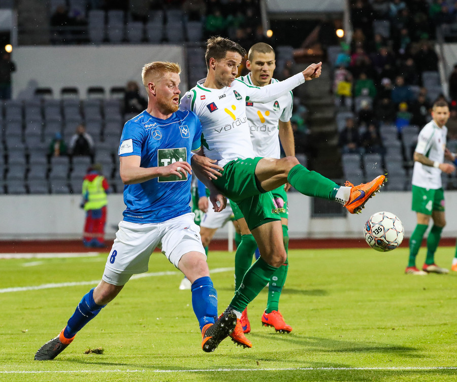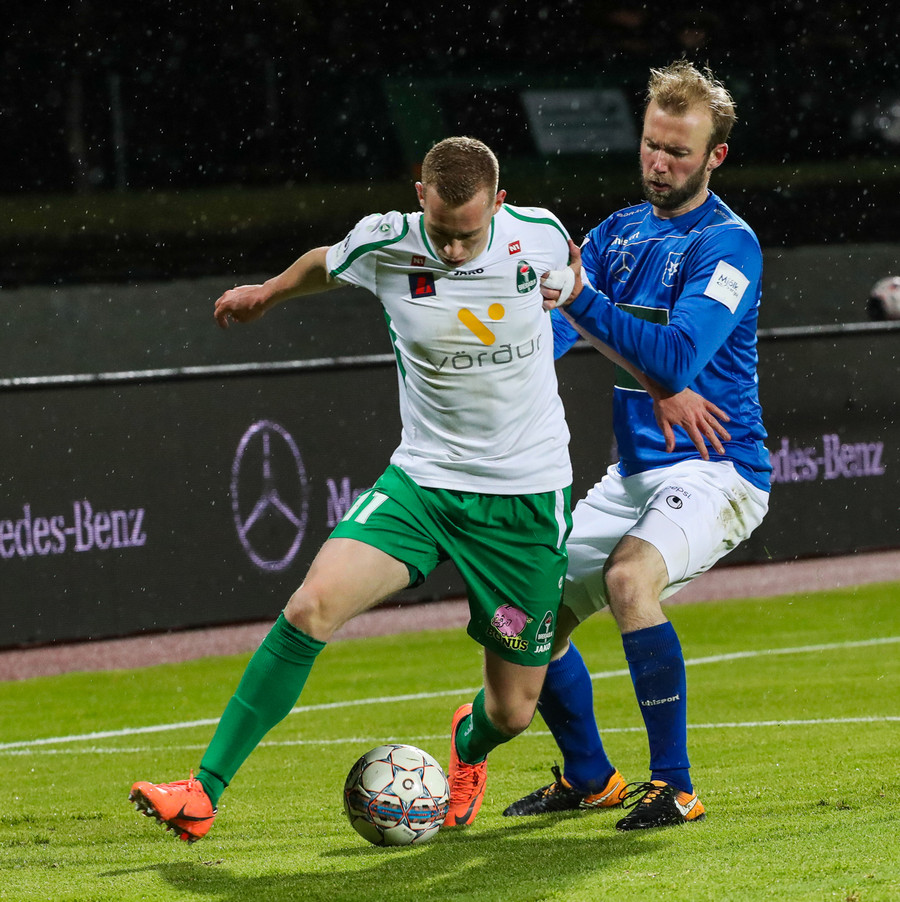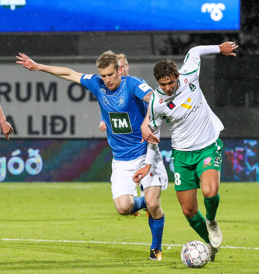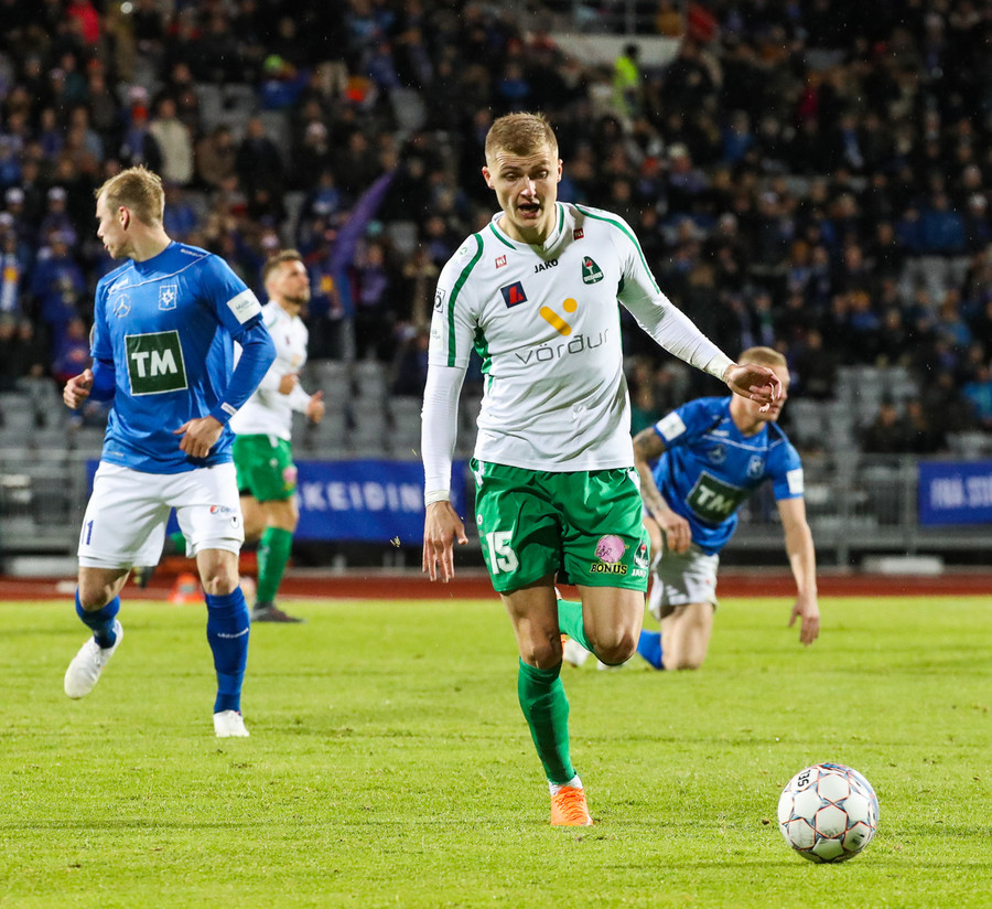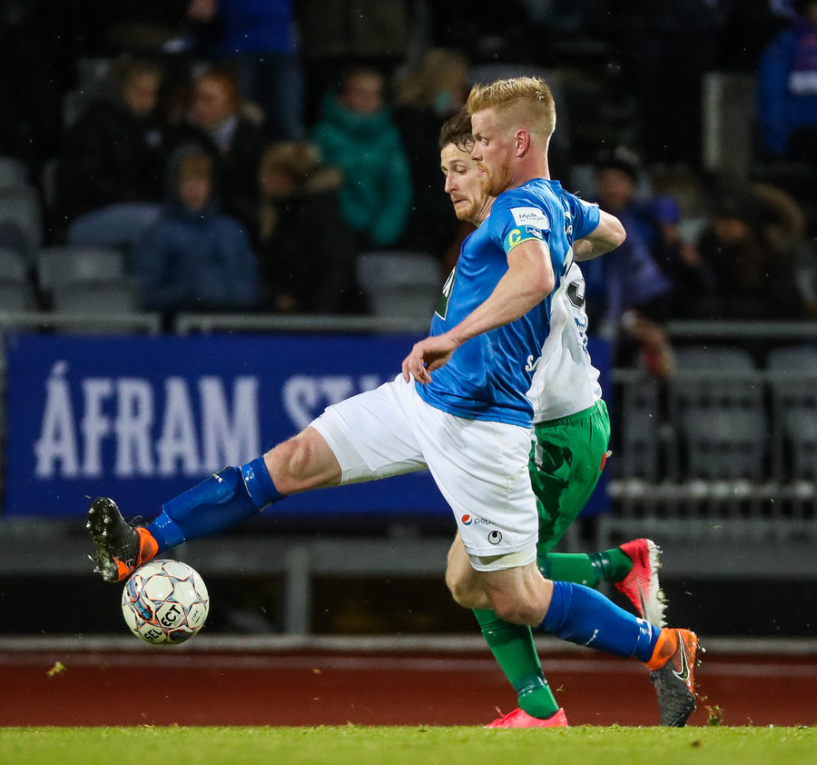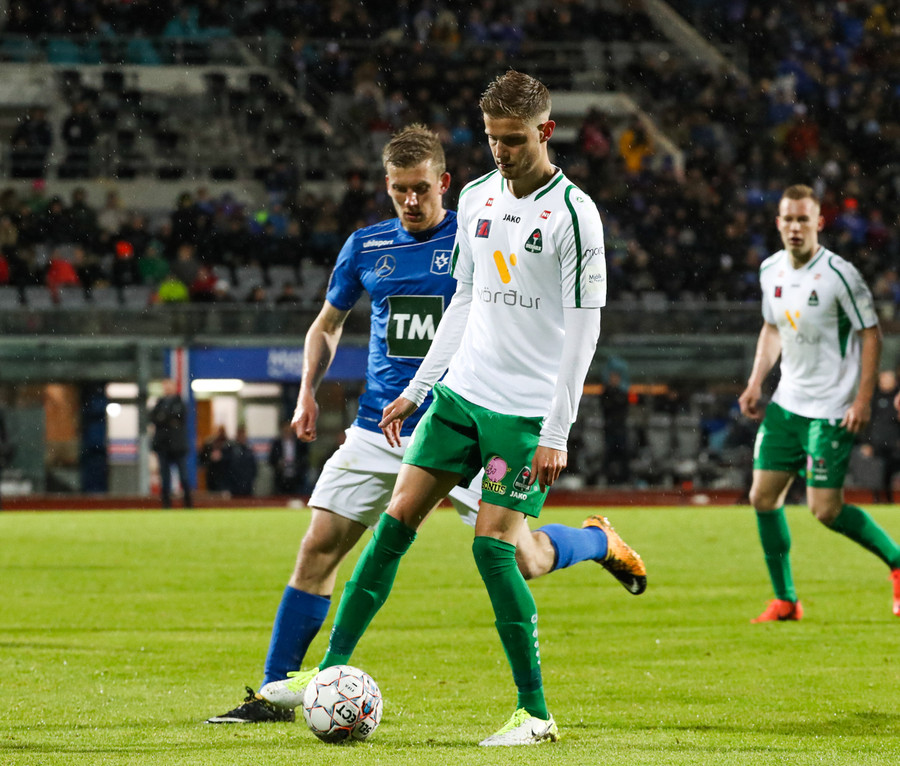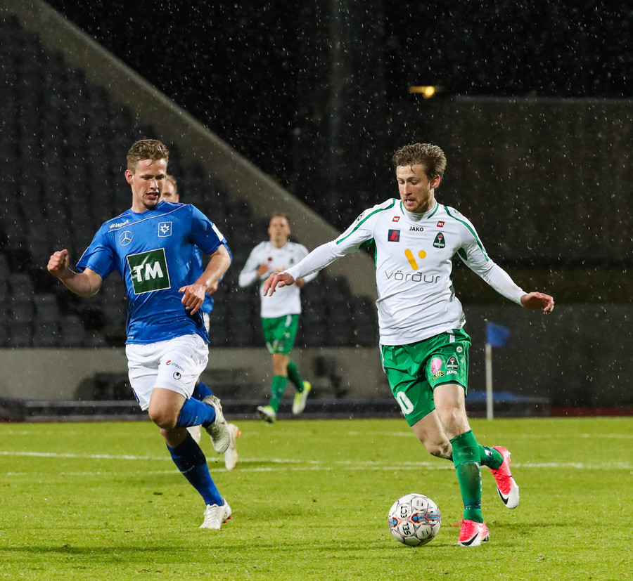 Þorsteinn Már á leiðinni upp kantinn en Davíð nær að trufla hann og fyrirgjöf Þorsteins er ömurleg, beint útaf.