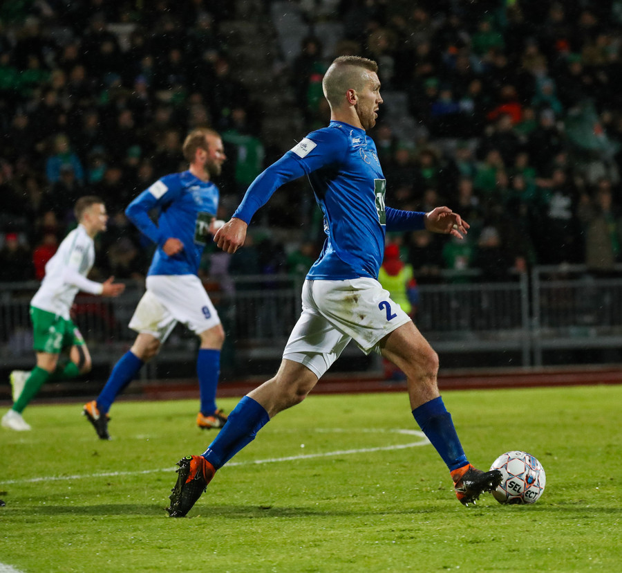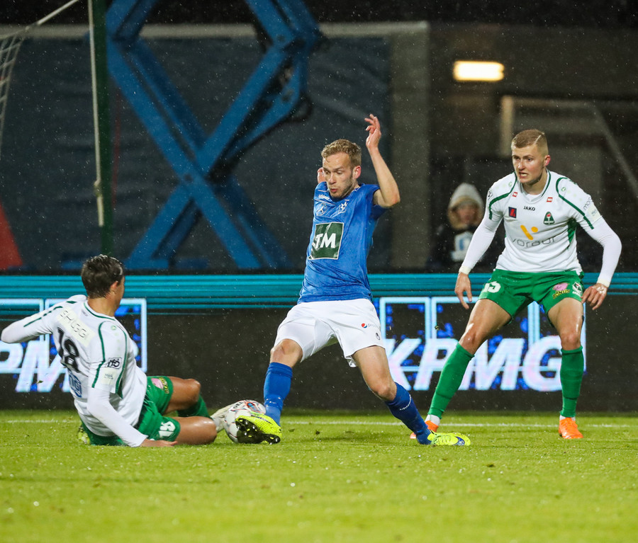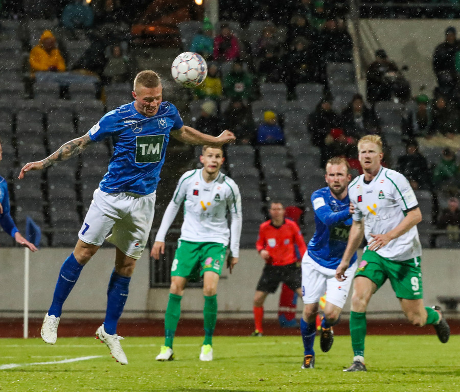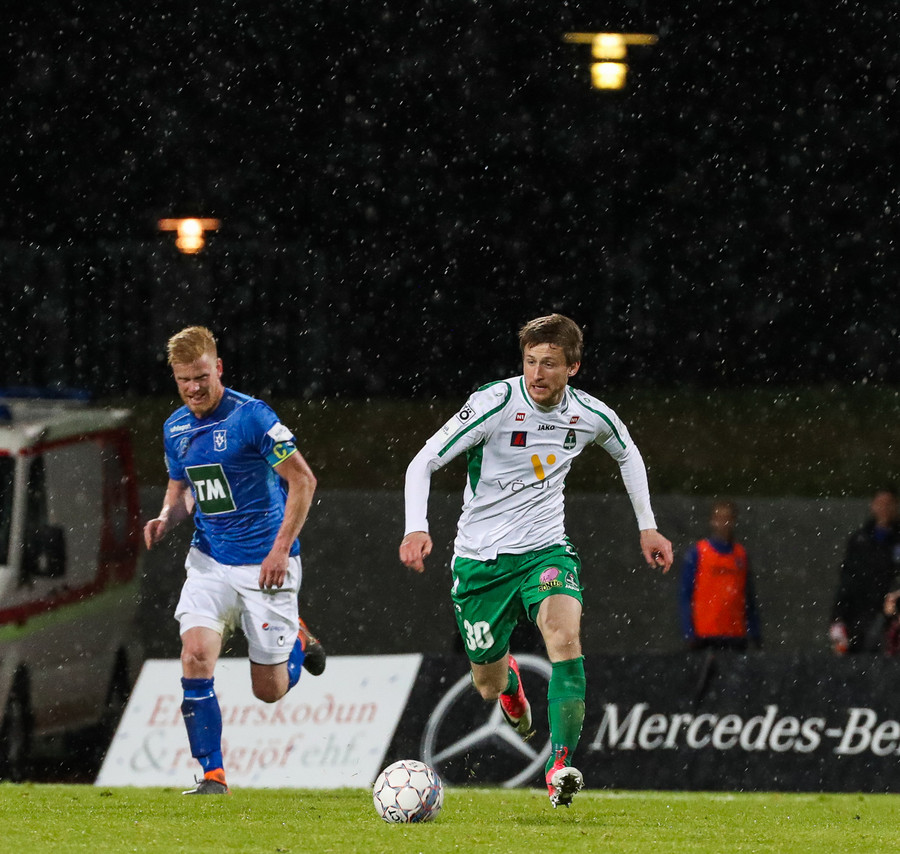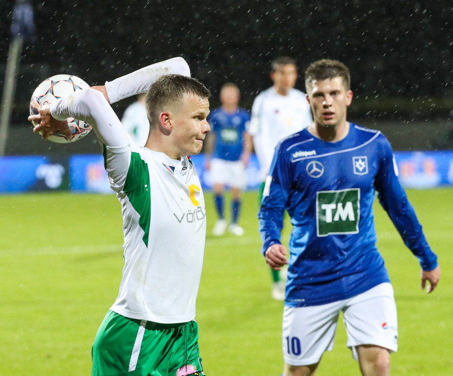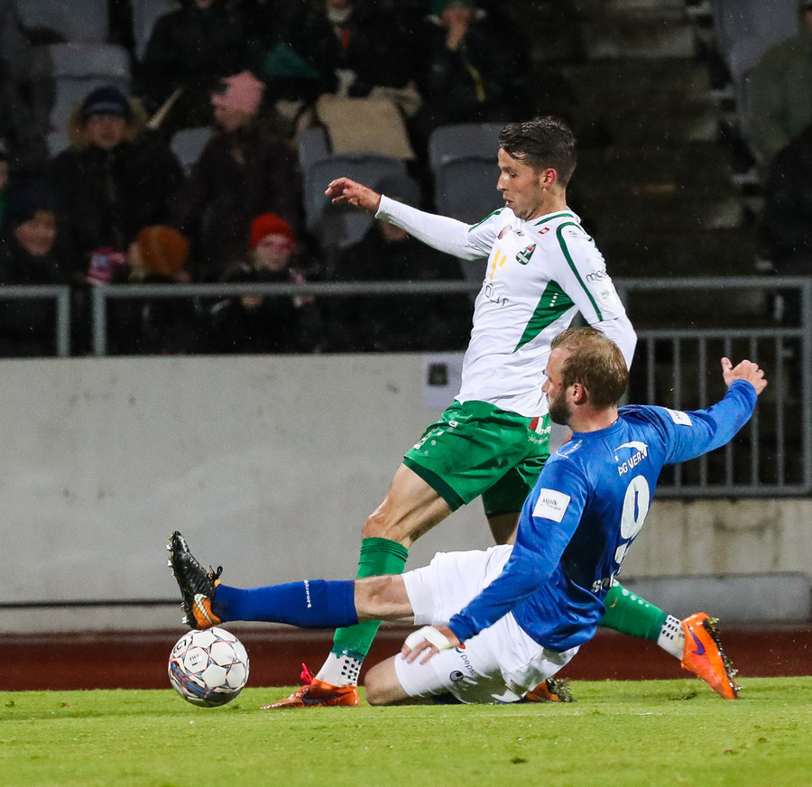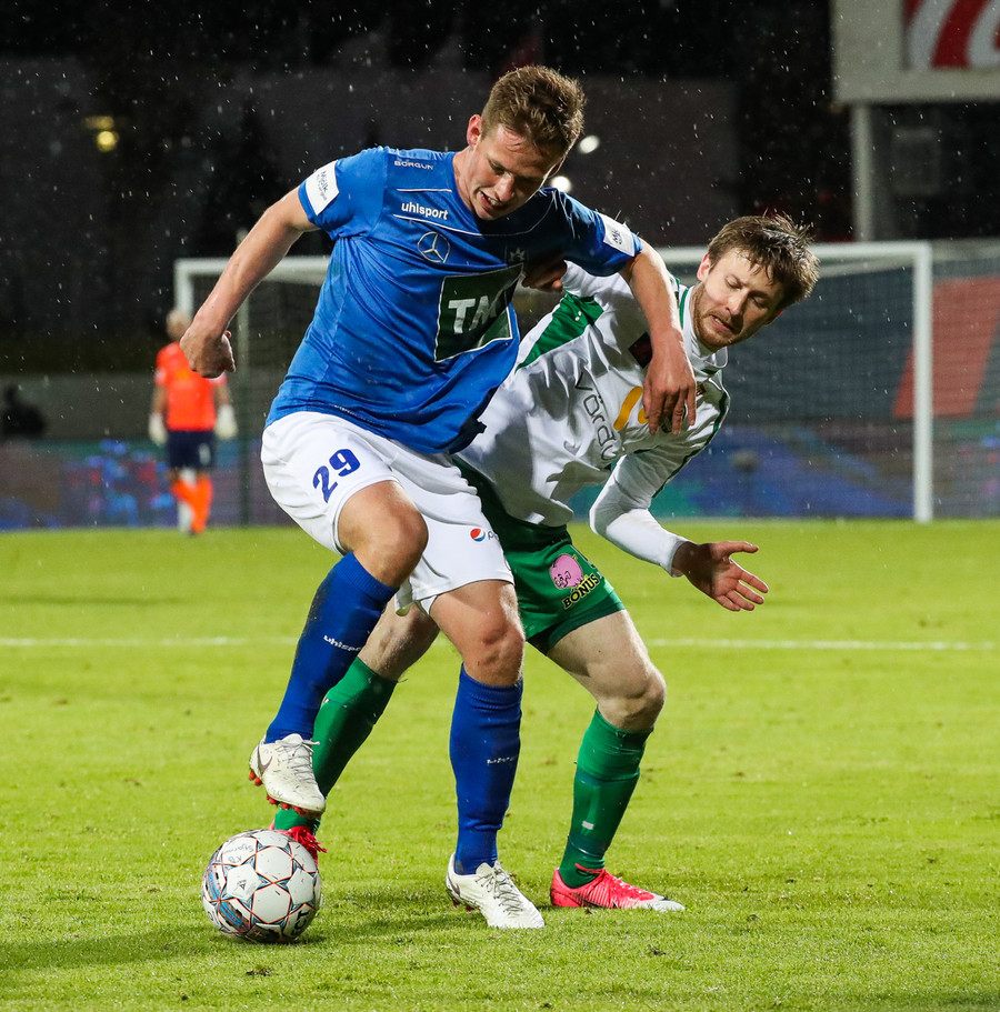 Þorsteinn Már á leiðinni upp kantinn en Davíð nær að trufla hann og fyrirgjöf Þorsteins er ömurleg, beint útaf.