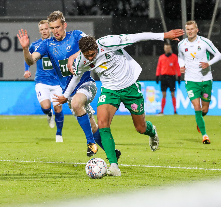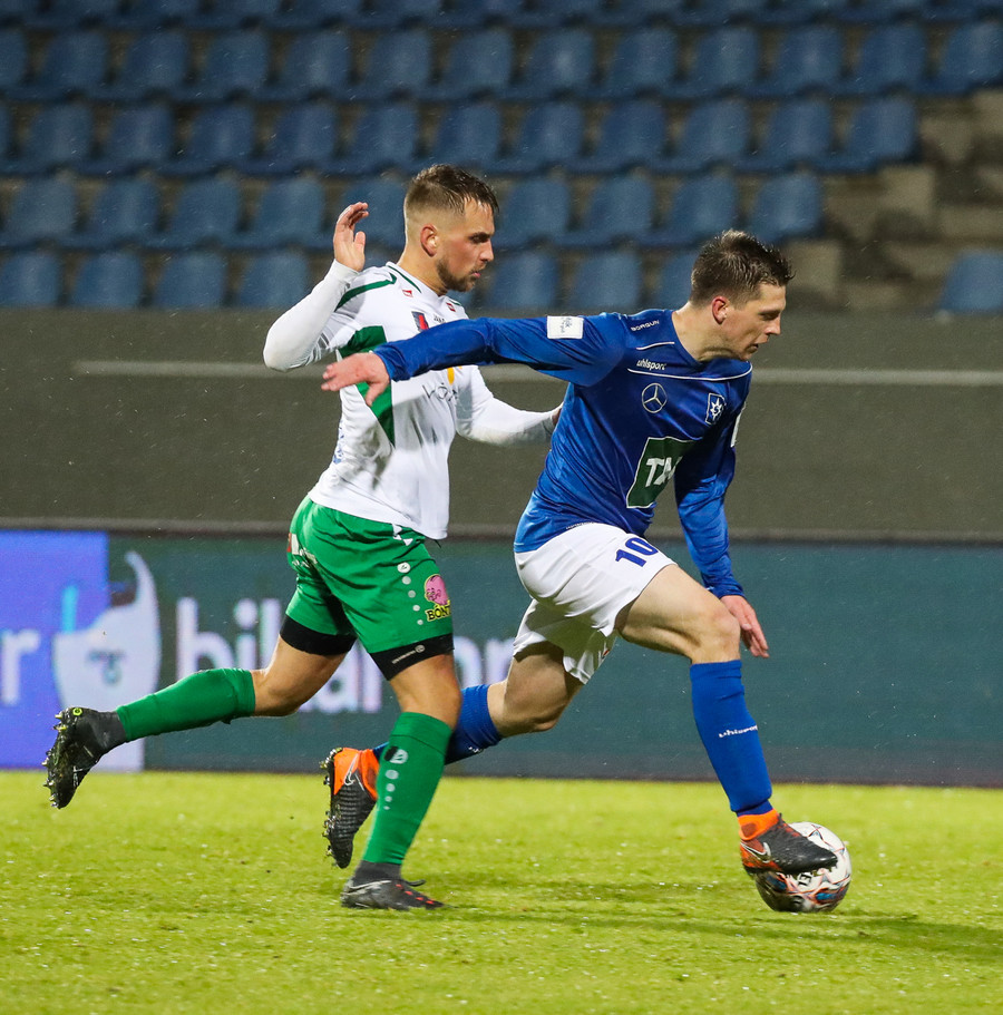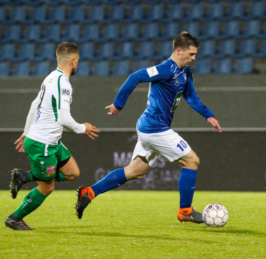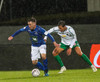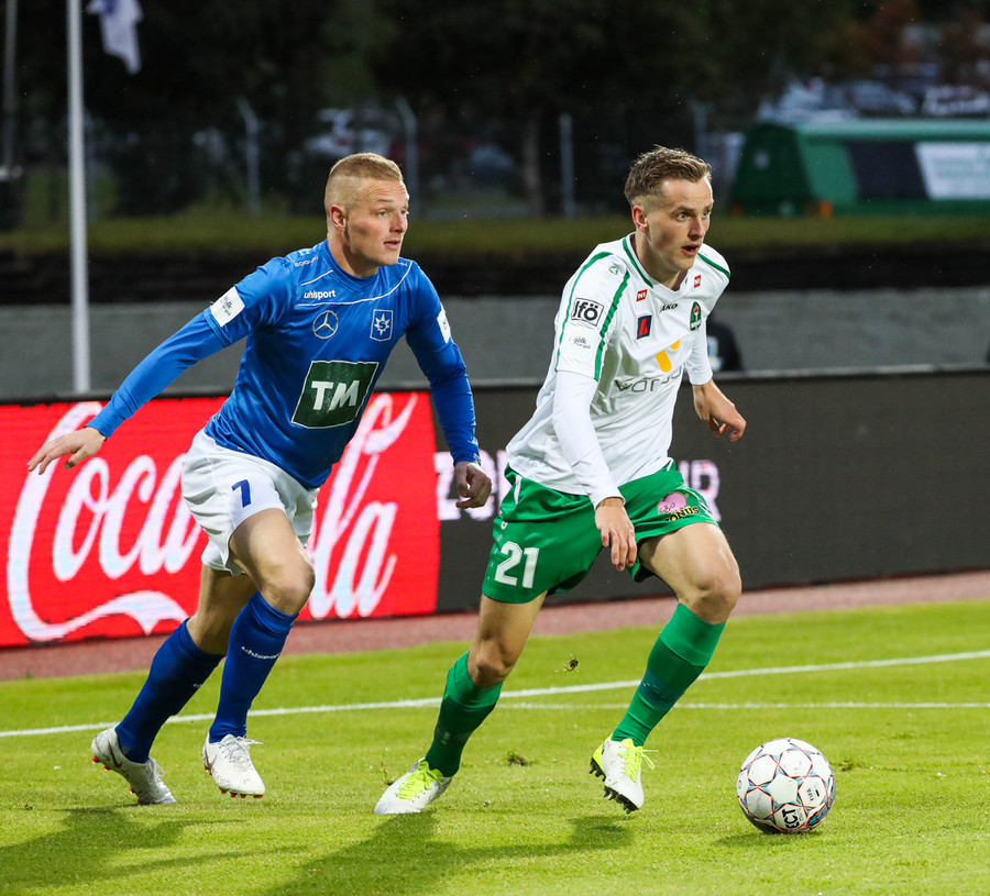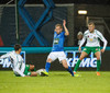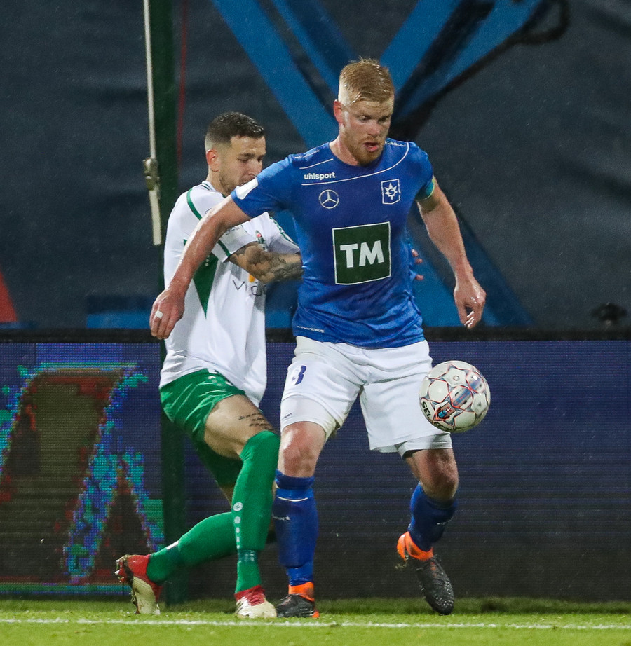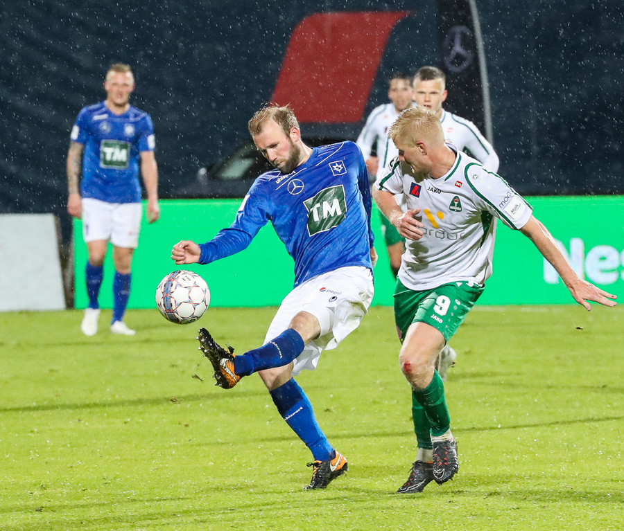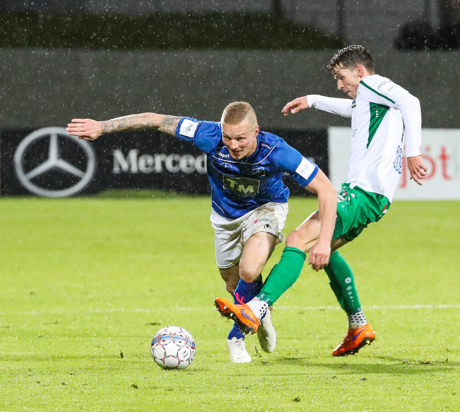 Þorsteinn Már á leiðinni upp kantinn en Davíð nær að trufla hann og fyrirgjöf Þorsteins er ömurleg, beint útaf.