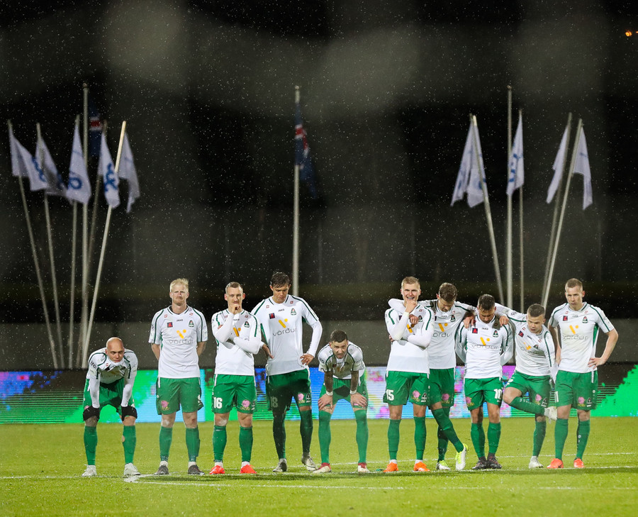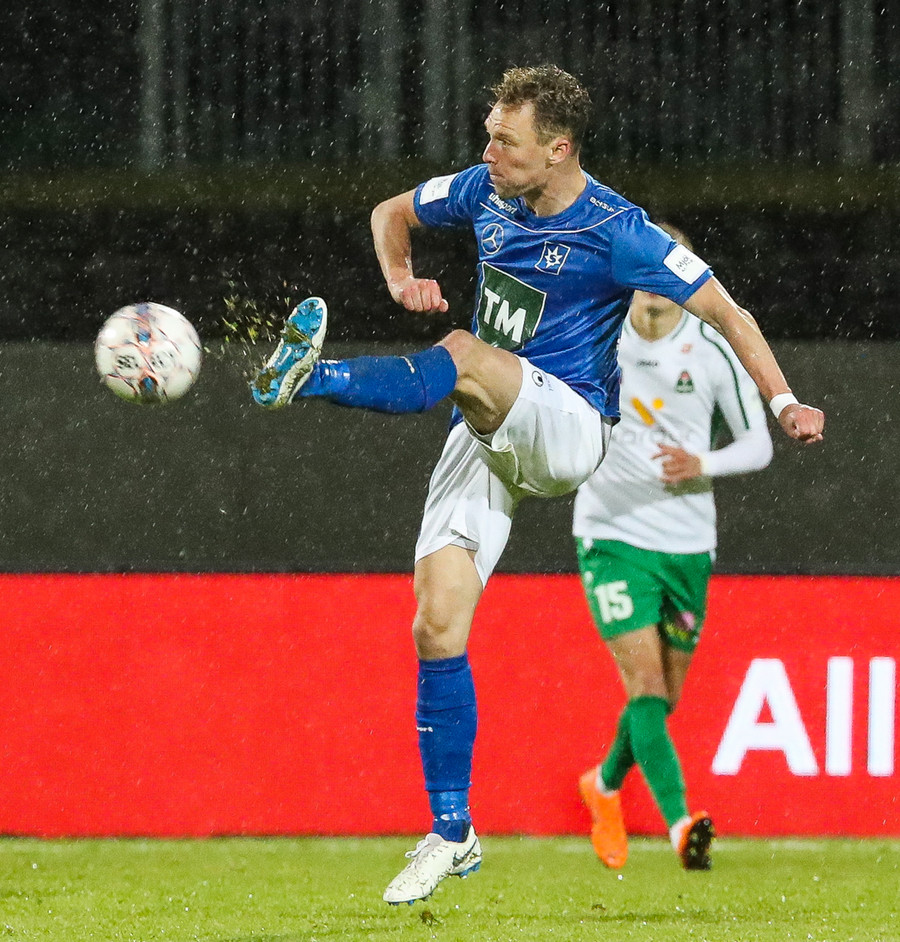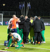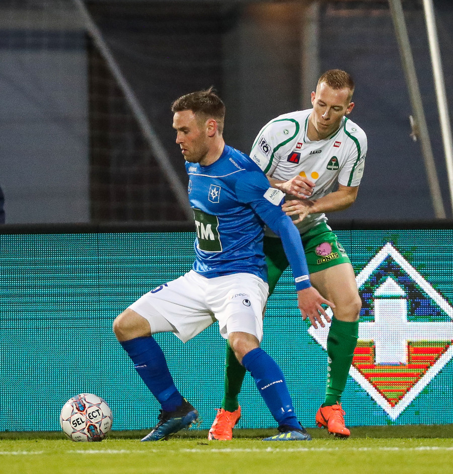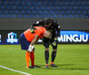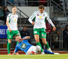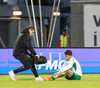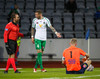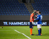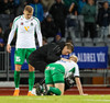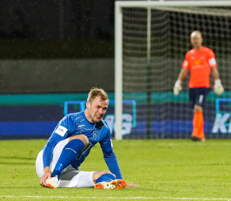 Hendrickx liggur hér eftir á vellinum, fyrri hálfleikur hefur einkennst af því að menn liggja eftir, vonandi er í lagi með hann.