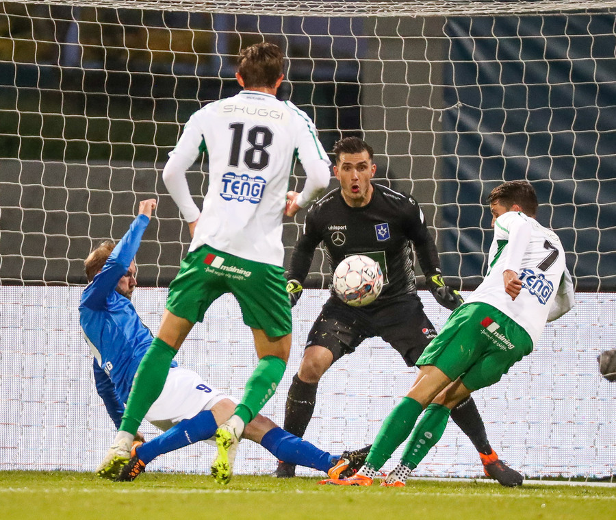 Vááá Gulli Gull! Fyrirgjöf beint á Baldur sem nær að sparka á markið af stuttu færi en Gulli á tánnum og ver stórkostlega!