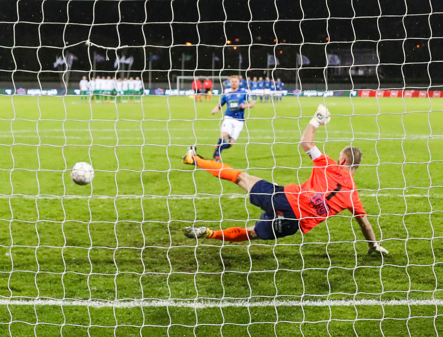 Halli Björns skutlar sér alveg út að stöng og ver vítið frá Arnóri, frábær varsla og Blikarnir búnir að klúðra tveim vítum í röð!