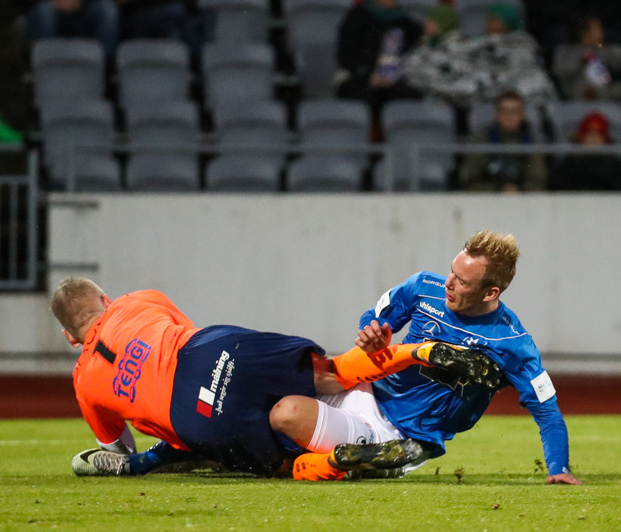 Blikar að fá aukaspyrnu á stórhættulegum stað, Brynjar fer full harkalega í tæklingu á Hendrickx, tekur boltann en Þóroddur metur þetta sem brot.