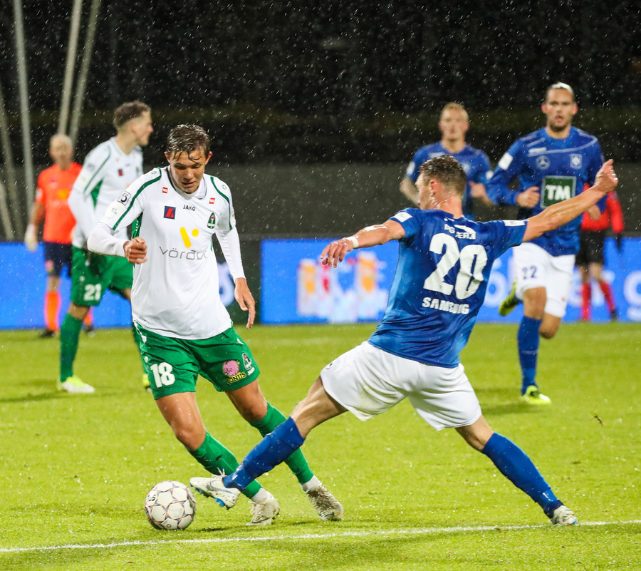 Gísli við það að komast í boltann hérna inn í teig á undan Halla en Halli var eins og köttur, þvílíkur hraði og réðst á boltann!
