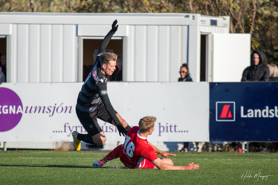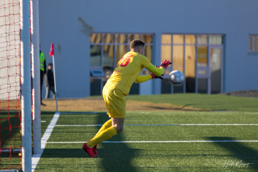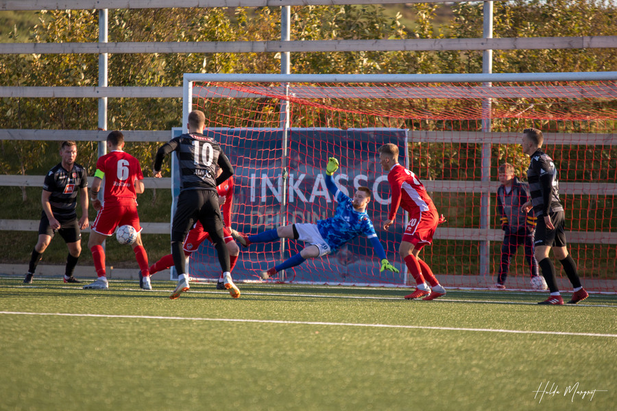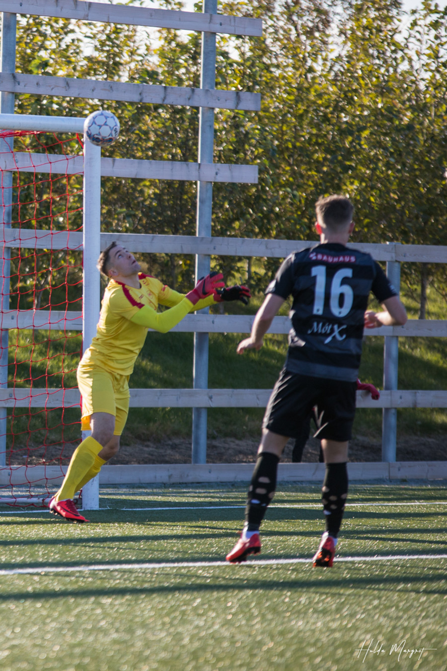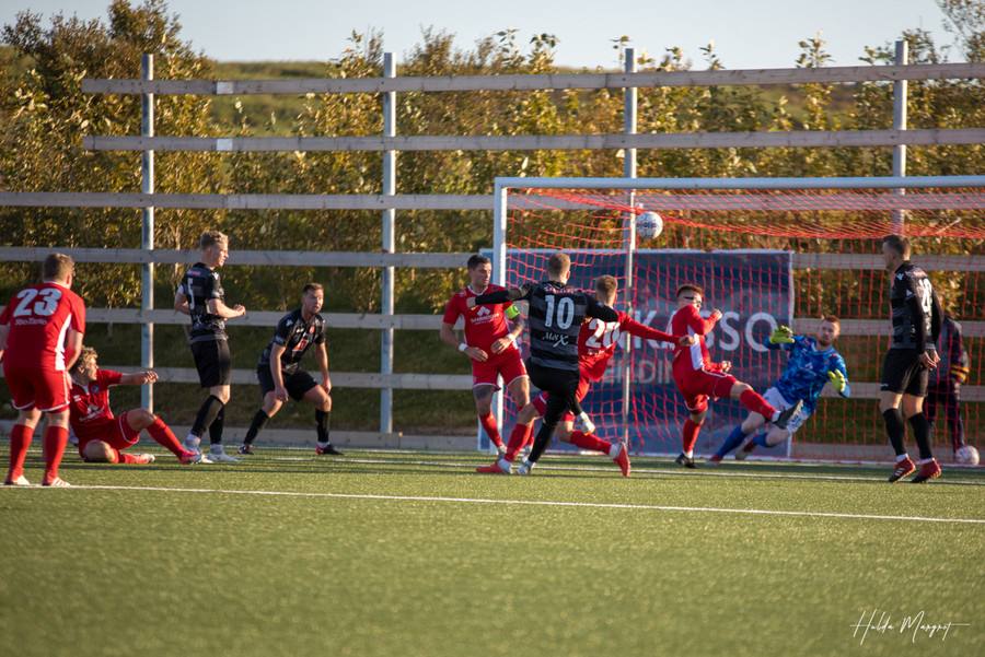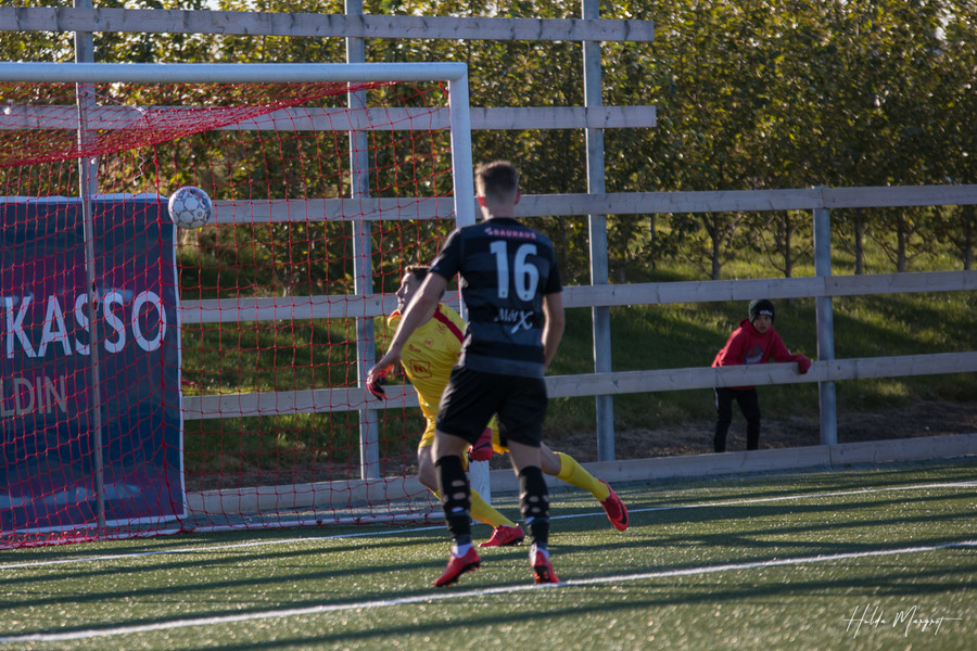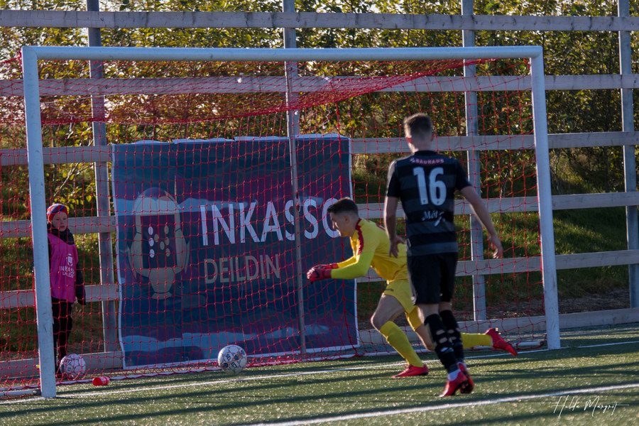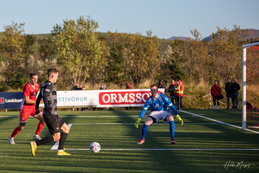 Kristinn Pétursson í fínu færi að bæta við öðru marki en skotið beint á Arnar. Komnar 5 min í uppbót