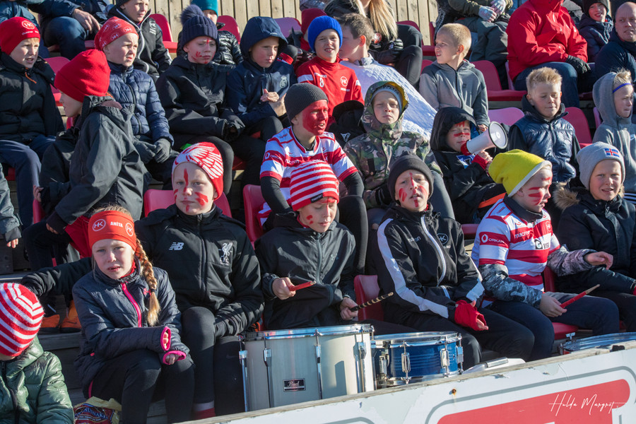 Það heyrist vel í ungri stuðningsmannasveit HK. Fín mæting hjá báðum liðum í dag. Eflaust í kringum 300 manns