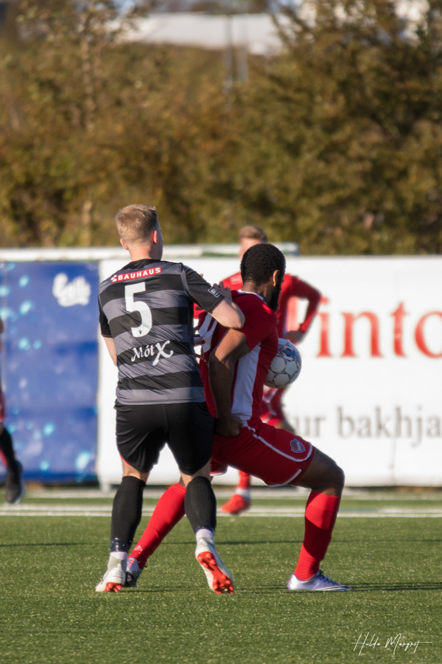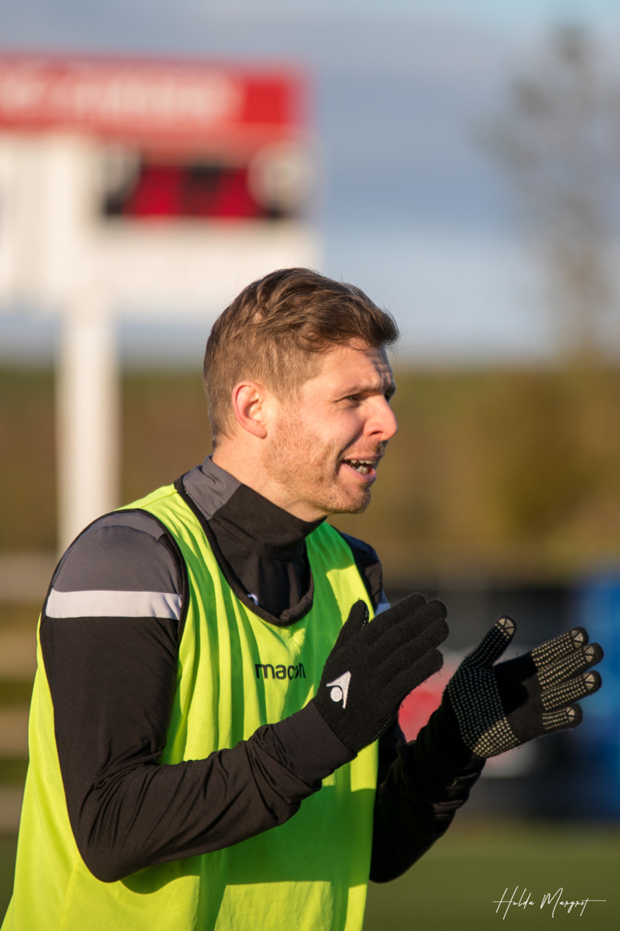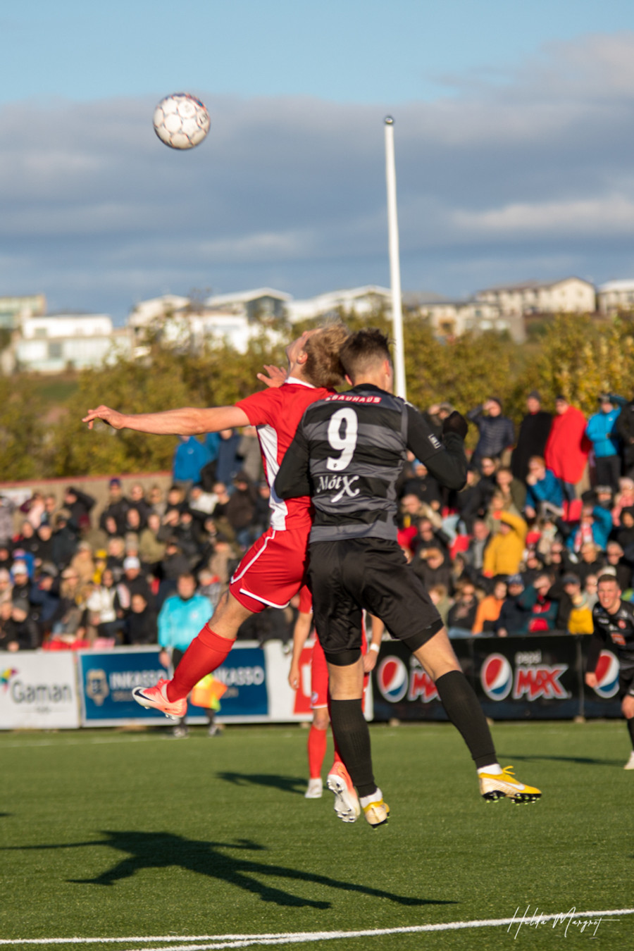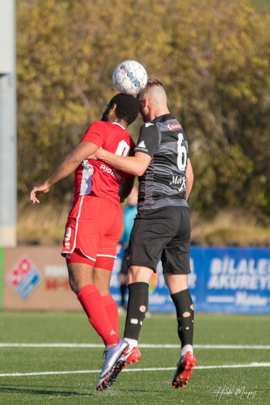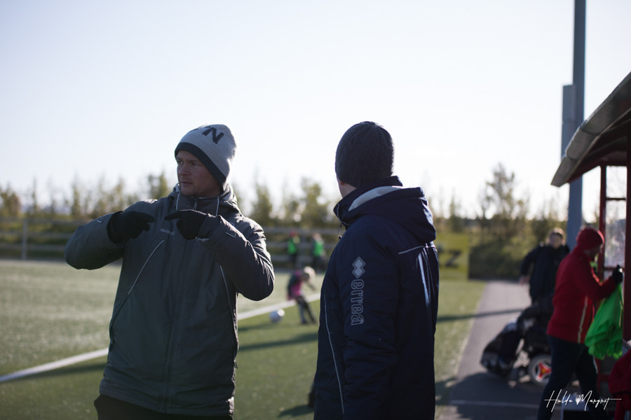 Tveir boltar í leik en skotið frá Bjarna langt framhjá. Hjálpaði þeim ekki að vera með tvo bolta þarna . Dómarinn hefði átt að stoppa þarna leik